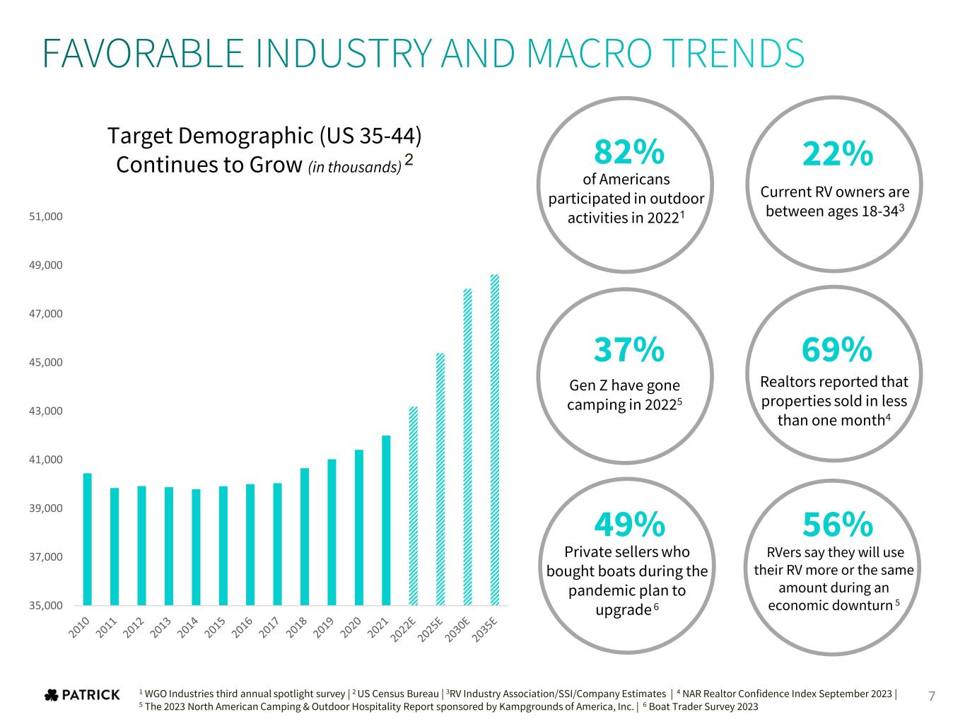 71 WGO Industries third annual spotlight survey | 2 US Census Bureau | 3RV Industry Association/SSI/Company Estimates | 4 NAR Realtor Confidence Index September 2023 | 5 The 2023 North American Camping & Outdoor Hospitality Report sponsored by Kampgrounds of America, Inc. | 6 Boat Trader Survey 2023 Target Demographic (US 35-44) Continues to Grow (in thousands) 2 of Americans participated in outdoor activities in 20221 82% Current RV owners are between ages 18-343 22% Gen Z have gone camping in 20225 37% Realtors reported that properties sold in less than one month4 69% Private sellers who bought boats during the pandemic plan to upgrade 6 49% RVers say they will use their RV more or the same amount during an economic downturn 5 56% 35,000 37,000 39,000 41,000 43,000 45,000 47,000 49,000 51,000
