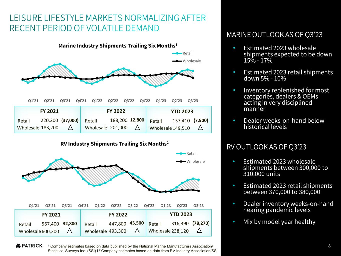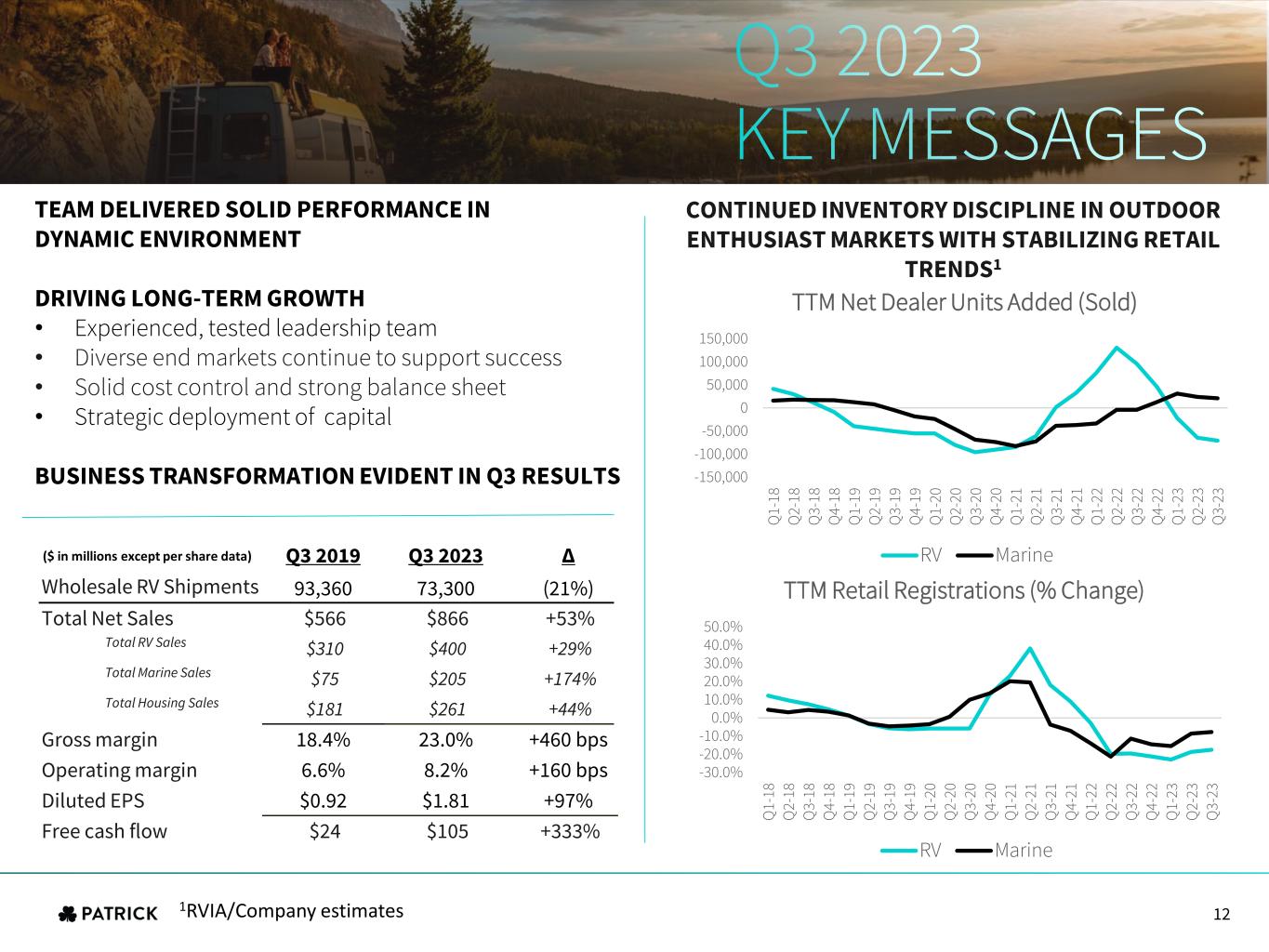 TEAM DELIVERED SOLID PERFORMANCE IN DYNAMIC ENVIRONMENT DRIVING LONG-TERM GROWTH • Experienced, tested leadership team • Diverse end markets continue to support success • Solid cost control and strong balance sheet • Strategic deployment of capital BUSINESS TRANSFORMATION EVIDENT IN Q3 RESULTS Q3 2019 Q3 2023 Δ Wholesale RV Shipments 93,360 73,300 (21%) Total Net Sales $566 $866 +53% Total RV Sales $310 $400 +29% Total Marine Sales $75 $205 +174% Total Housing Sales $181 $261 +44% Gross margin 18.4% 23.0% +460 bps Operating margin 6.6% 8.2% +160 bps Diluted EPS $0.92 $1.81 +97% Free cash flow $24 $105 +333% CONTINUED INVENTORY DISCIPLINE IN OUTDOOR ENTHUSIAST MARKETS WITH STABILIZING RETAIL TRENDS1 ($ in millions except per share data) 1RVIA/Company estimates -150,000 -100,000 -50,000 0 50,000 100,000 150,000 Q 1- 18 Q 2- 18 Q 3- 18 Q 4- 18 Q 1- 19 Q 2- 19 Q 3- 19 Q 4- 19 Q 1- 20 Q 2- 20 Q 3- 20 Q 4- 20 Q 1- 21 Q 2- 21 Q 3- 21 Q 4- 21 Q 1- 22 Q 2- 22 Q 3- 22 Q 4- 22 Q 1- 23 Q 2- 23 Q 3- 23 TTM Net Dealer Units Added (Sold) RV Marine -30.0% -20.0% -10.0% 0.0% 10.0% 20.0% 30.0% 40.0% 50.0% Q 1- 18 Q 2- 18 Q 3- 18 Q 4- 18 Q 1- 19 Q 2- 19 Q 3- 19 Q 4- 19 Q 1- 20 Q 2- 20 Q 3- 20 Q 4- 20 Q 1- 21 Q 2- 21 Q 3- 21 Q 4- 21 Q 1- 22 Q 2- 22 Q 3- 22 Q 4- 22 Q 1- 23 Q 2- 23 Q 3- 23 TTM Retail Registrations (% Change) RV Marine 12