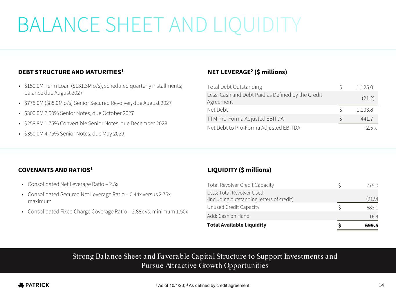• $150.0M Term Loan ($131.3M o/s), scheduled quarterly installments; balance due August 2027 • $775.0M ($85.0M o/s) Senior Secured Revolver, due August 2027 • $300.0M 7.50% Senior Notes, due October 2027 • $258.8M 1.75% Convertible Senior Notes, due December 2028 • $350.0M 4.75% Senior Notes, due May 2029 Total Debt Outstanding $ 1,125.0 Less: Cash and Debt Paid as Defined by the Credit Agreement (21.2) Net Debt $ 1,103.8 TTM Pro-Forma Adjusted EBITDA $ 441.7 Net Debt to Pro-Forma Adjusted EBITDA 2.5 x Total Revolver Credit Capacity $ 775.0 Less: Total Revolver Used (including outstanding letters of credit) (91.9) Unused Credit Capacity $ 683.1 Add: Cash on Hand 16.4 Total Available Liquidity $ 699.5 • Consolidated Net Leverage Ratio – 2.5x • Consolidated Secured Net Leverage Ratio – 0.44x versus 2.75x maximum • Consolidated Fixed Charge Coverage Ratio – 2.88x vs. minimum 1.50x COVENANTS AND RATIOS1 DEBT STRUCTURE AND MATURITIES1 NET LEVERAGE2 ($ millions) LIQUIDITY ($ millions) 1 As of 10/1/23; 2 As defined by credit agreement Strong Balance Sheet and Favorable Capita l Structure to Support Investments and Pursue Attractive Growth Opportunities 14