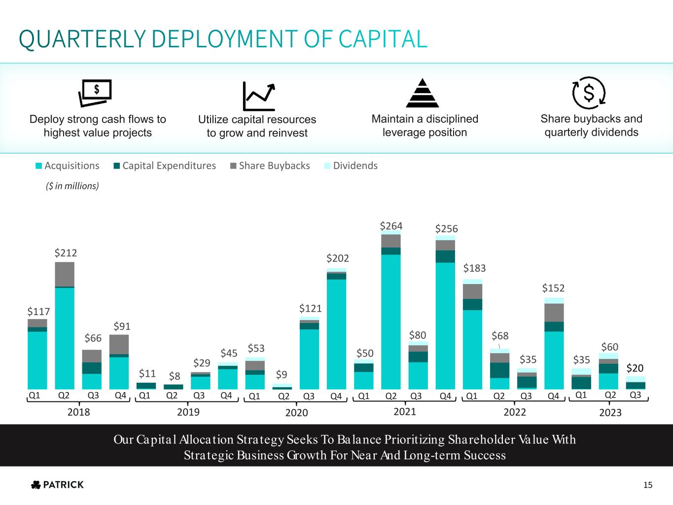$117 $212 $66 $91 $11 $8 $29 $45 $53 $9 $121 $202 $50 $264 $80 $256 $183 $68 $35 $152 $35 $60 $22 Acquisitions Capital Expenditures Share Buybacks Dividends Q1 Q2 Q3 Q4 Q1 Q2 Q3 Q4 ($ in millions) Our Capita l Allocation Stra tegy Seeks To Balance Prioritizing Shareholder Value With Stra tegic Business Growth For Near And Long-term Success Deploy strong cash flows to highest value projects Maintain a disciplined leverage position Utilize capital resources to grow and reinvest Share buybacks and quarterly dividends 2022 Q1 Q2 Q3 Q4 2021 Q1 Q2 Q3 Q4 Q1 Q2 Q3 20232020 Q1 Q2 Q3 Q4 20192018 0 15