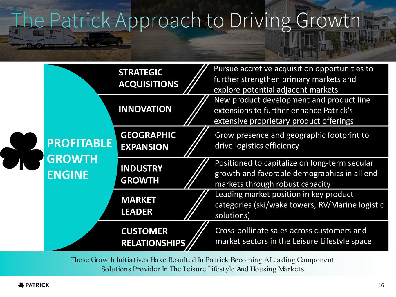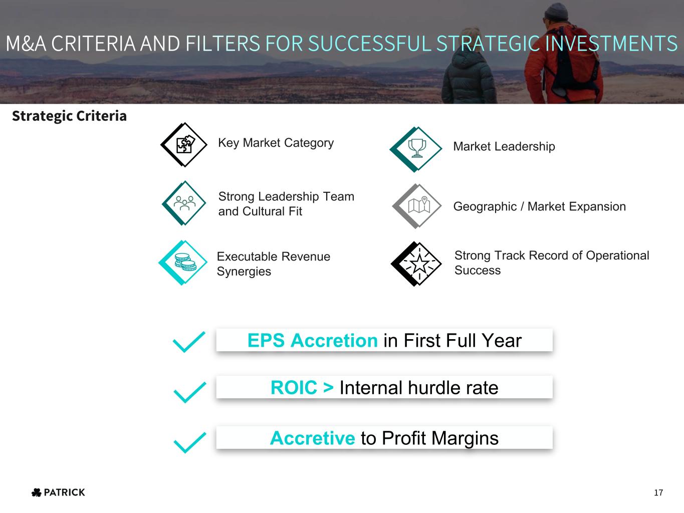 These Growth Initia tives Have Resulted In Patrick Becoming A Leading Component Solutions Provider In The Leisure Lifestyle And Housing Markets PROFITABLE GROWTH ENGINE STRATEGIC ACQUISITIONS Pursue accretive acquisition opportunities to further strengthen primary markets and explore potential adjacent markets INNOVATION New product development and product line extensions to further enhance Patrick’s extensive proprietary product offerings GEOGRAPHIC EXPANSION Grow presence and geographic footprint to drive logistics efficiency INDUSTRY GROWTH Positioned to capitalize on long-term secular growth and favorable demographics in all end markets through robust capacity MARKET LEADER Leading market position in key product categories (ski/wake towers, RV/Marine logistic solutions) CUSTOMER RELATIONSHIPS Cross-pollinate sales across customers and market sectors in the Leisure Lifestyle space 16