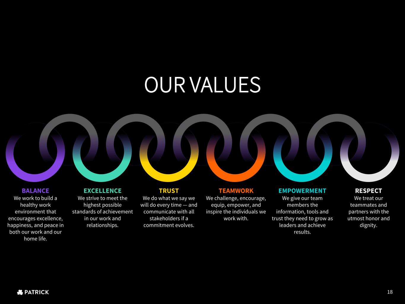 BALANCE We work to build a healthy work environment that encourages excellence, happiness, and peace in both our work and our home life. EXCELLENCE We strive to meet the highest possible standards of achievement in our work and relationships. TRUST We do what we say we will do every time — and communicate with all stakeholders if a commitment evolves. TEAMWORK We challenge, encourage, equip, empower, and inspire the individuals we work with. EMPOWERMENT We give our team members the information, tools and trust they need to grow as leaders and achieve results. RESPECT We treat our teammates and partners with the utmost honor and dignity. OUR VALUES 18