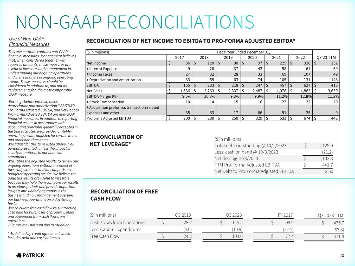 RECONCILIATION OF NET LEVERAGE* -Earnings before interest, taxes, depreciation and amortization (“EBITDA”), Pro-Forma Adjusted EBITDA, and Net Debt to Pro-Forma Adjusted EBITDA are non-GAAP financial measures. In addition to reporting financial results in accordance with accounting principles generally accepted in the United States, we provide non-GAAP operating results adjusted for certain items and other one-time items. -We adjust for the items listed above in all periods presented, unless the impact is clearly immaterial to our financial statements. -We utilize the adjusted results to review our ongoing operations without the effect of these adjustments and for comparison to budgeted operating results. We believe the adjusted results are useful to investors because they help them compare our results to previous periods and provide important insights into underlying trends in the business and how management oversees our business operations on a day-to-day basis. -We calculate free cash flow by subtracting cash paid for purchases of property, plant and equipment from cash flow from operations. - Figures may not sum due to rounding. * As defined by credit agreement which includes debt and cash balances RECONCILIATION OF NET INCOME TO EBITDA TO PRO-FORMA ADJUSTED EBITDA* RECONCILIATION OF FREE CASH FLOW Use of Non-GAAP Financial Measures This presentation contains non-GAAP financial measures. Management believes that, when considered together with reported amounts, these measures are useful to investors and management in understanding our ongoing operations and in the analysis of ongoing operating trends. These measures should be considered in addition to, and not as replacements for, the most comparable GAAP measure. ($ in millions) Total debt outstanding @ 10/1/2023 $ 1,125.0 Less: cash on hand @ 10/3/2023 (21.2) Net debt @ 10/3/2023 $ 1,103.8 TTM Pro-Forma Adjusted EBITDA $ 441.7 Net Debt to Pro-Forma Adjusted EBITDA 2.5x ($ in millions) Q3 2019 Q3 2023 Cash Flows from Operations $ 28.2 $ 115.5 Less: Capital Expenditures (4.0) (10.9) Free Cash Flow $ 24.2 $ 104.6 20 Q3 2023 TTM $ 475.7 (63.8) $ 411.9 FY 2017 $ 99.9 (22.5) $ 77.4 ($ in millions) Fiscal Year Ended December 31, Net Income $ 86 $ 120 $ 90 $ 97 $ 225 $ 328 $ 152 + Interest Expense 9 26 37 43 58 61 69 + Income Taxes 27 32 28 33 69 107 49 + Depreciation and Amortization 33 55 63 74 105 131 143 EBITDA $ 155 $ 233 $ 218 $ 247 $ 457 $ 627 $ 413 Net Sales $ 1,636 $ 2,263 $ 2,337 $ 2,487 $ 4,078 $ 4,882 $ 3,639 EBITDA Margin (%) 9.5% 10.3% 9.3% 9.9% 11.2% 12.8% 11.3% + Stock Compensation 10 14 15 16 23 22 20 + Acquisition proforma, transaction-related expenses and other 35 33 17 66 51 25 9 Proforma Adjusted EBITDA $ 200 $ 280 $ 250 $ 329 $ 531 $ 674 $ 442 Q3'23 TTM2017 2018 2019 2020 2021 2022