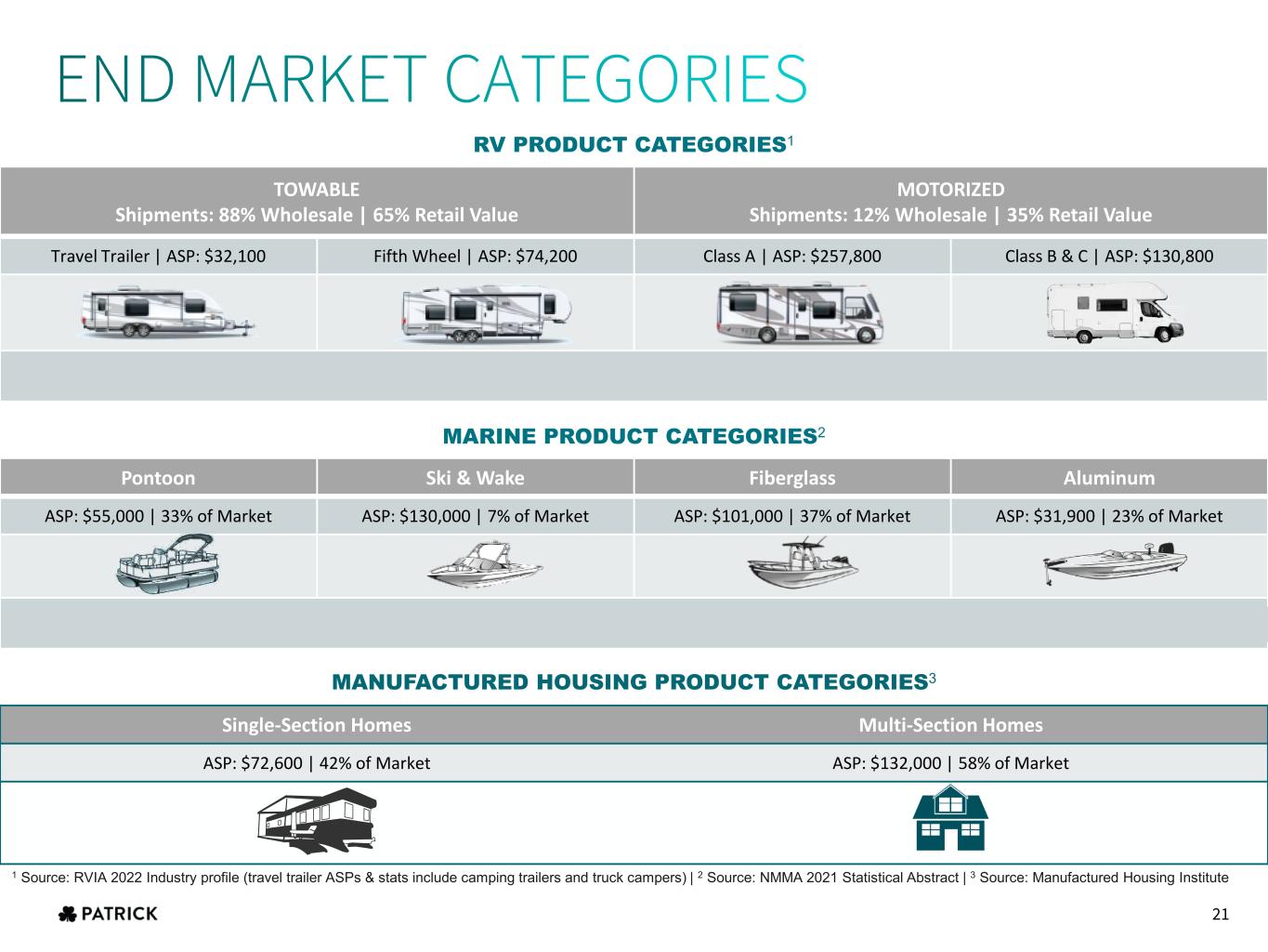 Single-Section Homes Multi-Section Homes ASP: $72,600 | 42% of Market ASP: $132,000 | 58% of Market TOWABLE Shipments: 88% Wholesale | 65% Retail Value MOTORIZED Shipments: 12% Wholesale | 35% Retail Value Travel Trailer | ASP: $32,100 Fifth Wheel | ASP: $74,200 Class A | ASP: $257,800 Class B & C | ASP: $130,800 RV PRODUCT CATEGORIES1 Pontoon Ski & Wake Fiberglass Aluminum ASP: $55,000 | 33% of Market ASP: $130,000 | 7% of Market ASP: $101,000 | 37% of Market ASP: $31,900 | 23% of Market U.S Expenditures on Boats, Engines, and Accessories Totaled $xxB in 2019 MARINE PRODUCT CATEGORIES2 MANUFACTURED HOUSING PRODUCT CATEGORIES3 1 Source: RVIA 2022 Industry profile (travel trailer ASPs & stats include camping trailers and truck campers) | 2 Source: NMMA 2021 Statistical Abstract | 3 Source: Manufactured Housing Institute 21