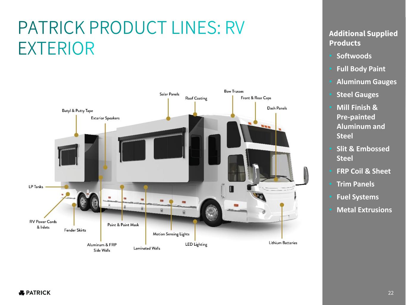 Additional Supplied Products • Softwoods • Full Body Paint • Aluminum Gauges • Steel Gauges • Mill Finish & Pre-painted Aluminum and Steel • Slit & Embossed Steel • FRP Coil & Sheet • Trim Panels • Fuel Systems • Metal Extrusions 22