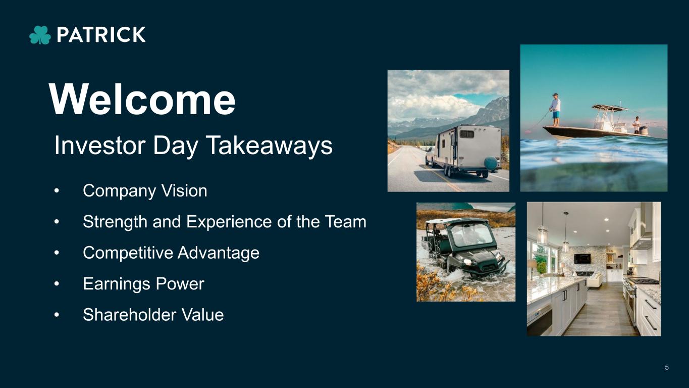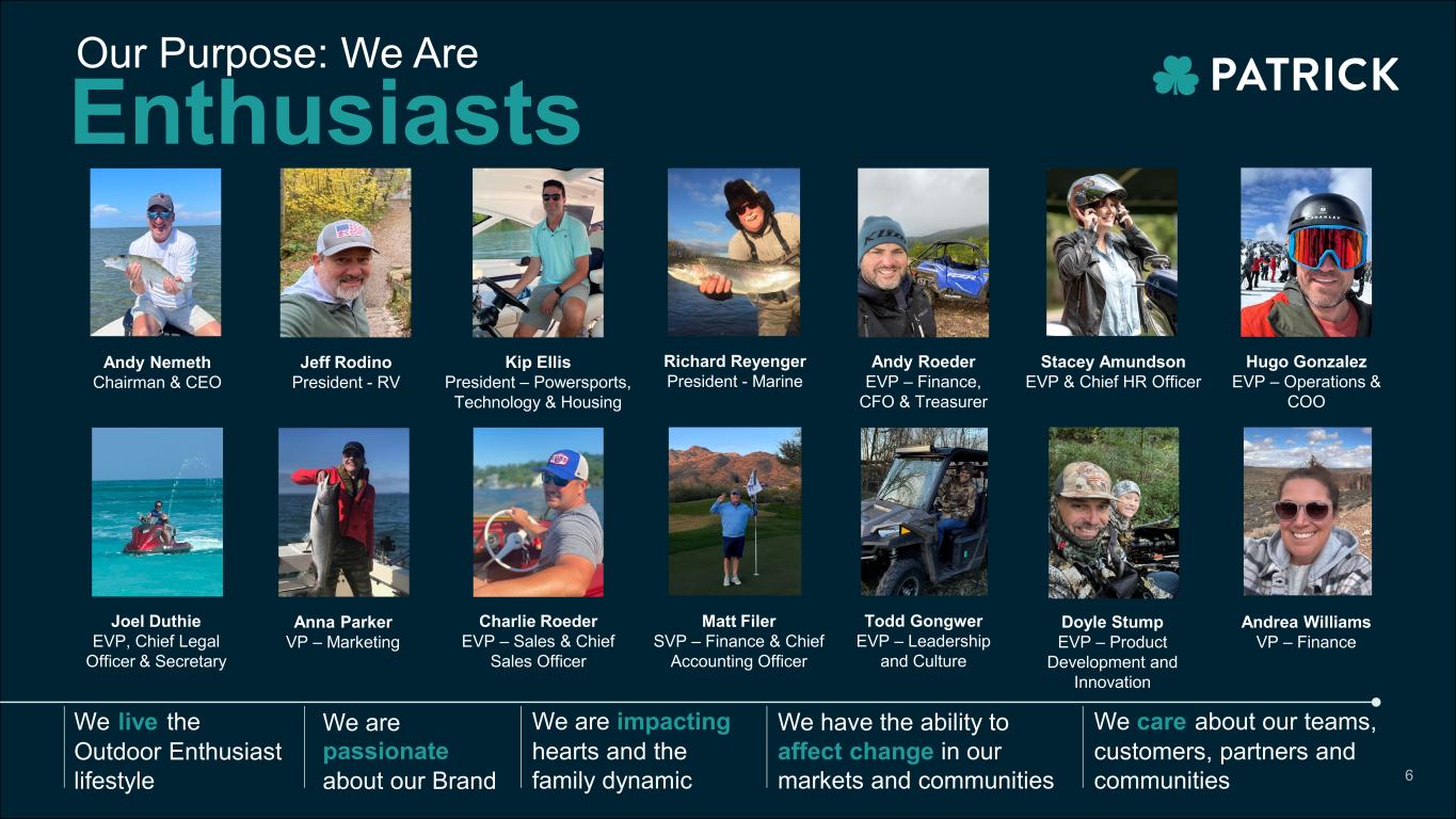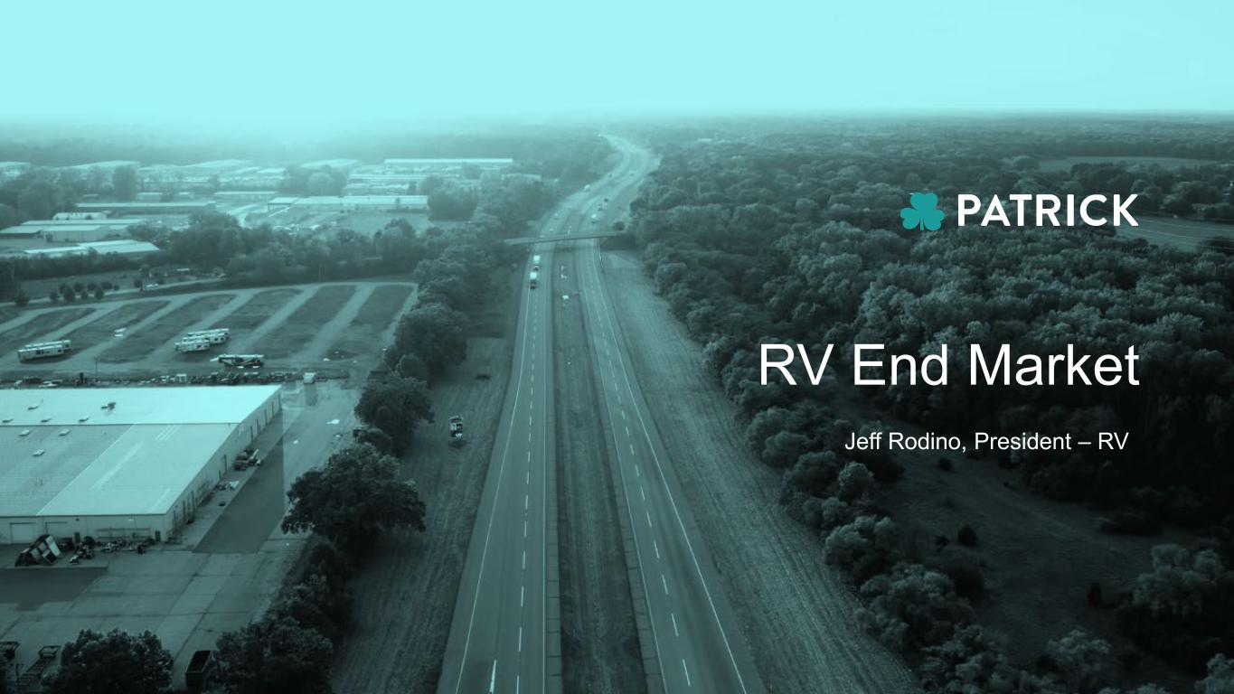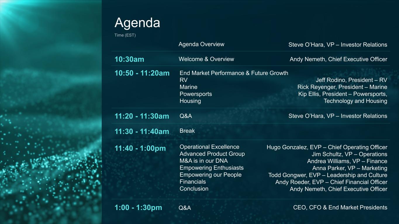 10:30am Time (EST) Welcome & Overview 10:50 - 11:20am End Market Performance & Future Growth RV Marine Powersports Housing 11:20 - 11:30am Q&A 11:30 - 11:40am Break Operational Excellence Advanced Product Group M&A is in our DNA Empowering Enthusiasts Empowering our People Financials Conclusion 11:40 - 1:00pm 1:00 - 1:30pm Q&A Agenda Andy Nemeth, Chief Executive Officer Steve O’Hara, VP – Investor Relations CEO, CFO & End Market Presidents Agenda Overview Steve O’Hara, VP – Investor Relations Jeff Rodino, President – RV Rick Reyenger, President – Marine Kip Ellis, President – Powersports, Technology and Housing Hugo Gonzalez, EVP – Chief Operating Officer Jim Schultz, VP – Operations Andrea Williams, VP – Finance Anna Parker, VP – Marketing Todd Gongwer, EVP – Leadership and Culture Andy Roeder, EVP – Chief Financial Officer Andy Nemeth, Chief Executive Officer
