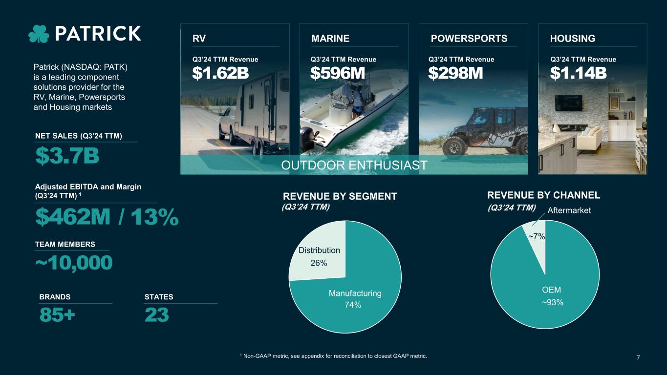Enthusiasts Our Purpose: We Are We live the Outdoor Enthusiast lifestyle We are passionate about our Brand We are impacting hearts and the family dynamic We have the ability to affect change in our markets and communities We care about our teams, customers, partners and communities 6 Andy Nemeth Chairman & CEO Andy Roeder EVP – Finance, CFO & Treasurer Kip Ellis President – Powersports, Technology & Housing Richard Reyenger President - Marine Doyle Stump EVP – Product Development and Innovation Hugo Gonzalez EVP – Operations & COO Joel Duthie EVP, Chief Legal Officer & Secretary Matt Filer SVP – Finance & Chief Accounting Officer Charlie Roeder EVP – Sales & Chief Sales Officer Todd Gongwer EVP – Leadership and Culture Jeff Rodino President - RV Stacey Amundson EVP & Chief HR Officer Anna Parker VP – Marketing Andrea Williams VP – Finance