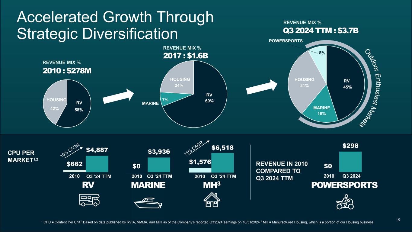 Patrick (NASDAQ: PATK) is a leading component solutions provider for the RV, Marine, Powersports and Housing markets 7 ~10,000 TEAM MEMBERS BRANDS 85+ NET SALES (Q3’24 TTM) $3.7B Adjusted EBITDA and Margin (Q3’24 TTM) 1 $462M STATES 23 REVENUE BY SEGMENT Aftermarket REVENUE BY CHANNEL Manufacturing Distribution Aftermarket OEM POWERSPORTSRV HOUSING $1.62B Q3’24 TTM Revenue $298M Q3’24 TTM Revenue $1.14B Q3’24 TTM Revenue MARINE $596M Q3’24 TTM Revenue (Q3’24 TTM) 26% 74% ~93% ~7% / 13% (Q3’24 TTM) 1 Non-GAAP metric, see appendix for reconciliation to closest GAAP metric. OUTDOOR ENTHUSIAST