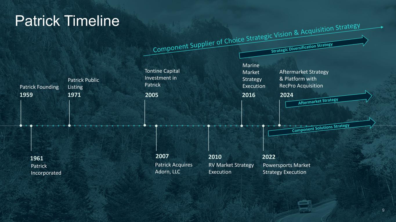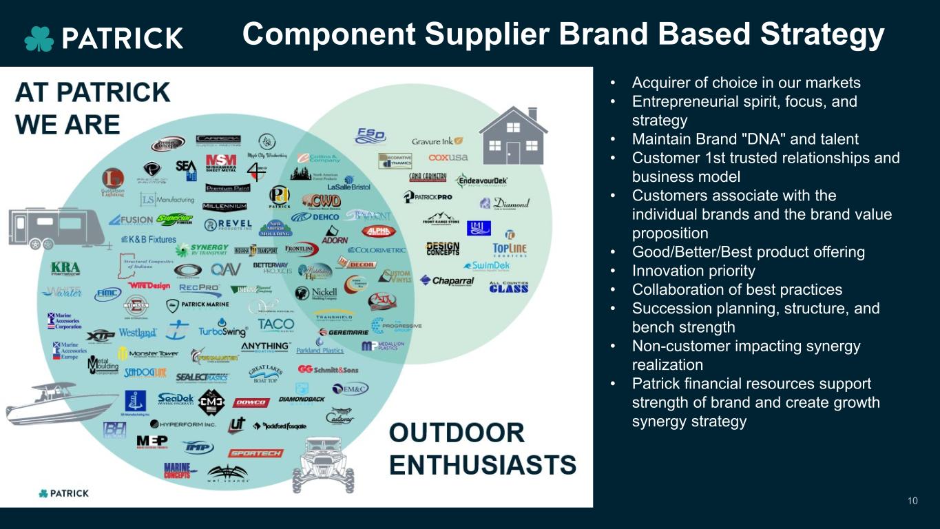 Patrick Founding Patrick Public Listing Patrick Incorporated Tontine Capital Investment in Patrick Patrick Acquires Adorn, LLC Powersports Market Strategy Execution RV Market Strategy Execution Aftermarket Strategy & Platform with RecPro Acquisition Patrick Timeline Marine Market Strategy Execution 1961 2005 2007 20222010 202420161959 1971 9