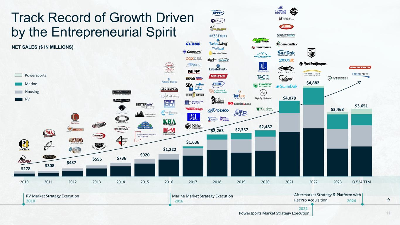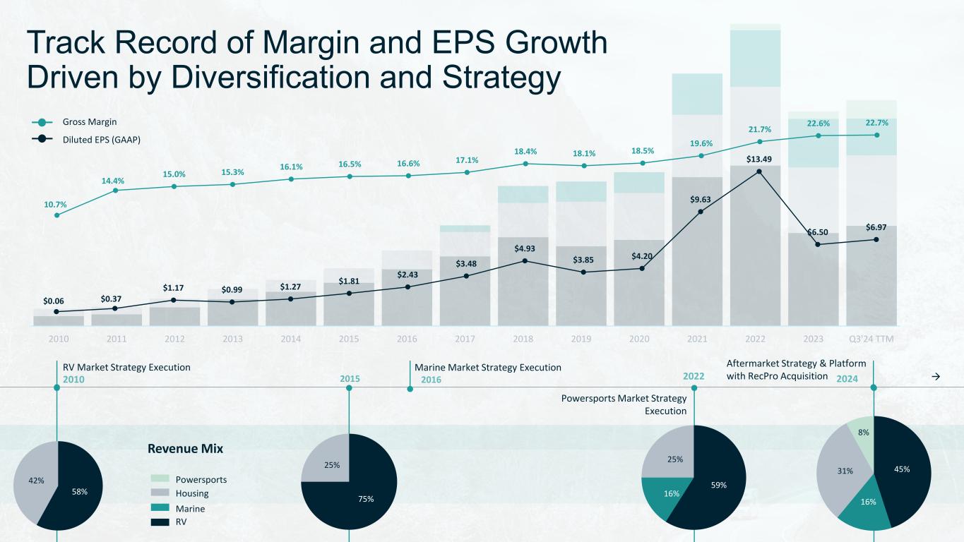  RV Market Strategy Execution Marine Market Strategy Execution Powersports Market Strategy Execution Aftermarket Strategy & Platform with RecPro Acquisition 2010 2011 2012 2013 2014 2015 2016 2017 2018 2019 2020 2021 2022 2023 Q3'24 TTM 10.7% 14.4% 15.0% 15.3% 16.1% 16.5% 16.6% 17.1% 18.4% 18.1% 18.5% 19.6% 21.7% 22.6% 22.7% $0.06 $0.37 $1.17 $0.99 $1.27 $1.81 $2.43 $3.48 $4.93 $3.85 $4.20 $9.63 $13.49 $6.50 $6.97 Track Record of Margin and EPS Growth Driven by Diversification and Strategy Gross Margin Diluted EPS (GAAP) Housing Powersports 58% 42% 59% 16% 25% 75% 25% 45% 16% 31% 8% RV Marine Revenue Mix
