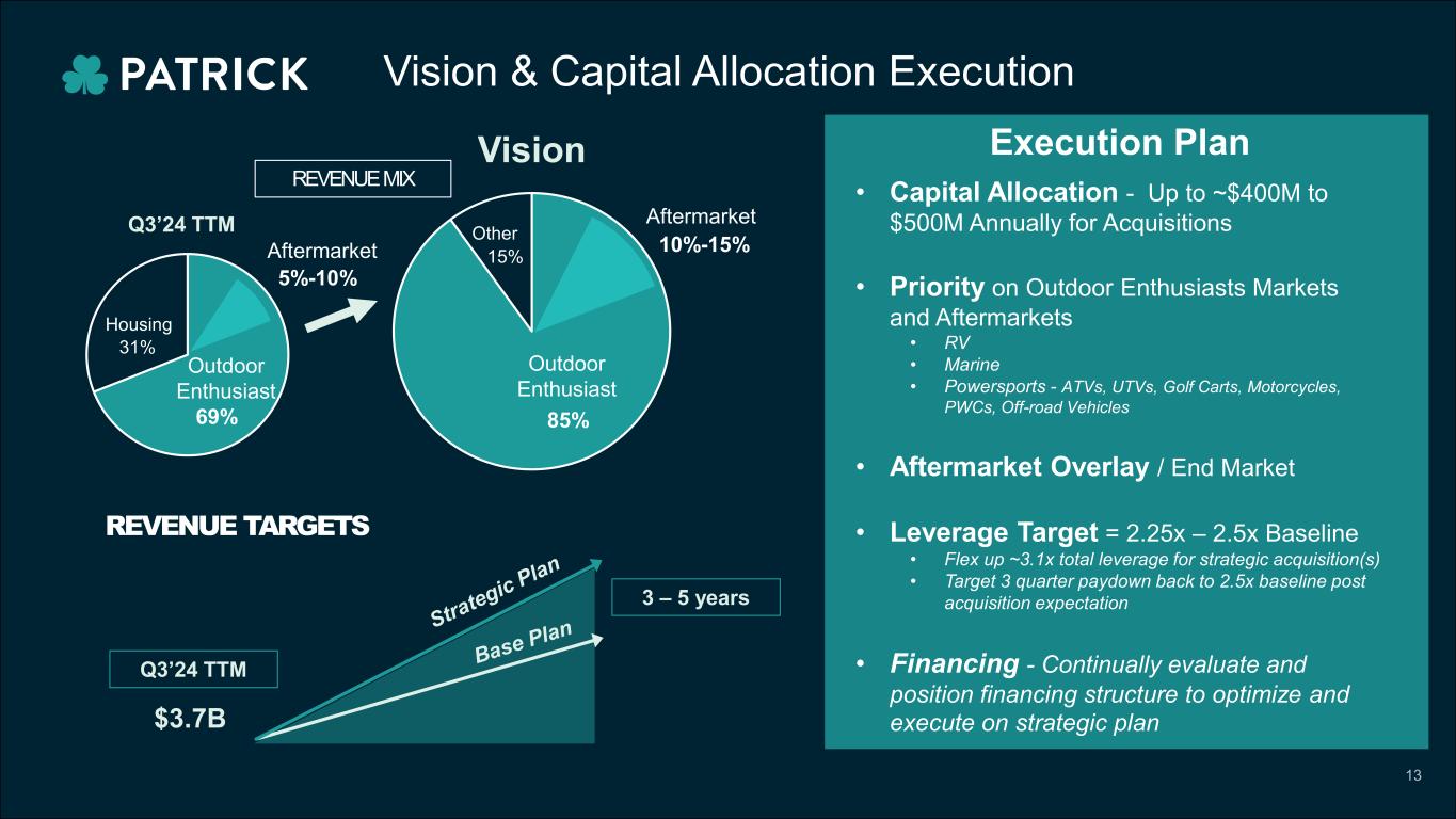 2010 2011 2012 2013 2014 2015 2016 2017 2018 2019 2020 2021 2022 2023 Q3'24 TTM Track Record of Growth Driven by the Entrepreneurial Spirit  RV Market Strategy Execution Marine Market Strategy Execution Powersports Market Strategy Execution Aftermarket Strategy & Platform with RecPro Acquisition $308 $437 $595 $736 $920 $1,222 $1,636 $2,263 $2,337 $2,487 $4,078 $4,882 $3,468 $3,651 $278 NET SALES ($ IN MILLIONS) RV Housing Marine Powersports 11