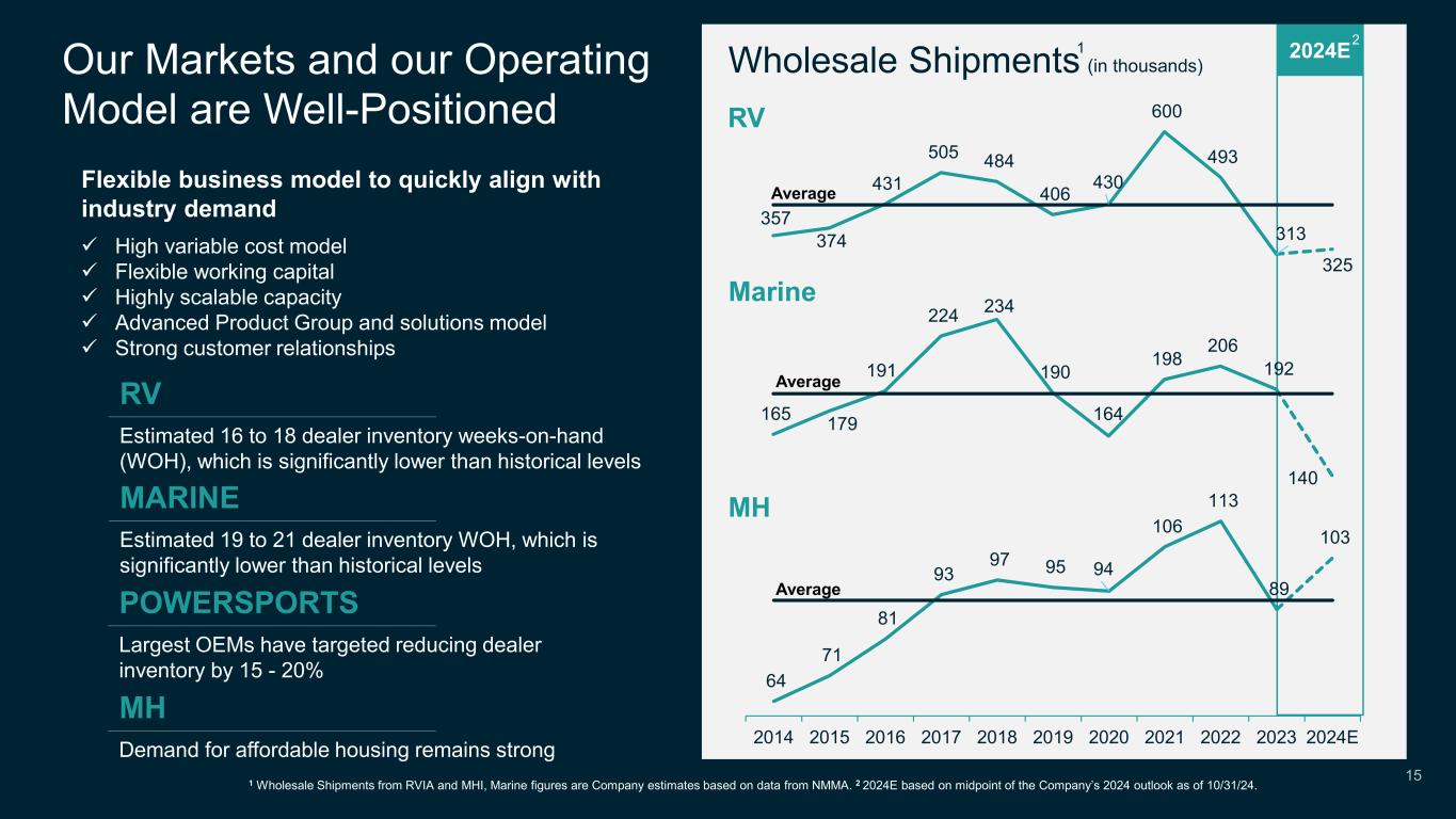 Our Markets and our Operating Model are Well-Positioned 1 Wholesale Shipments from RVIA and MHI, Marine figures are Company estimates based on data from NMMA. 2 2024E based on midpoint of the Company’s 2024 outlook as of 10/31/24. Estimated 16 to 18 dealer inventory weeks-on-hand (WOH), which is significantly lower than historical levels RV 357 374 431 505 484 406 430 600 493 313 325 RV Marine 2024E Estimated 19 to 21 dealer inventory WOH, which is significantly lower than historical levels MARINE Largest OEMs have targeted reducing dealer inventory by 15 - 20% POWERSPORTS Demand for affordable housing remains strong MH 165 179 191 224 234 190 164 198 206 192 140 64 71 81 93 97 95 94 106 113 89 103 2014 2015 2016 2017 2018 2019 2020 2021 2022 2023 2024E MH Wholesale Shipments Average Average Average Flexible business model to quickly align with industry demand  High variable cost model  Flexible working capital  Highly scalable capacity  Advanced Product Group and solutions model  Strong customer relationships (in thousands) 15 1 2