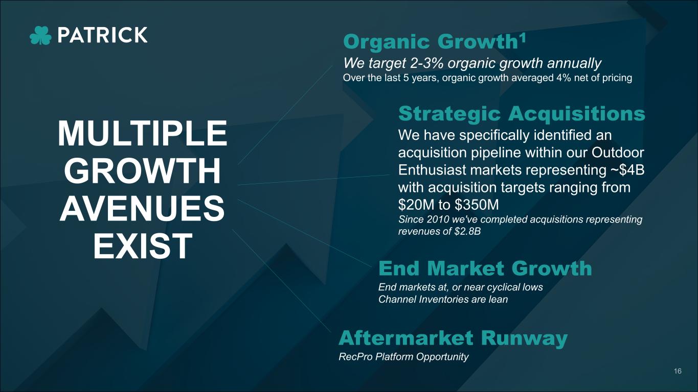 Organic Growth1 We target 2-3% organic growth annually Over the last 5 years, organic growth averaged 4% net of pricing MULTIPLE GROWTH AVENUES EXIST Strategic Acquisitions We have specifically identified an acquisition pipeline within our Outdoor Enthusiast markets representing ~$4B with acquisition targets ranging from $20M to $350M Since 2010 we've completed acquisitions representing revenues of $2.8B End Market Growth End markets at, or near cyclical lows Channel Inventories are lean Aftermarket Runway RecPro Platform Opportunity 16