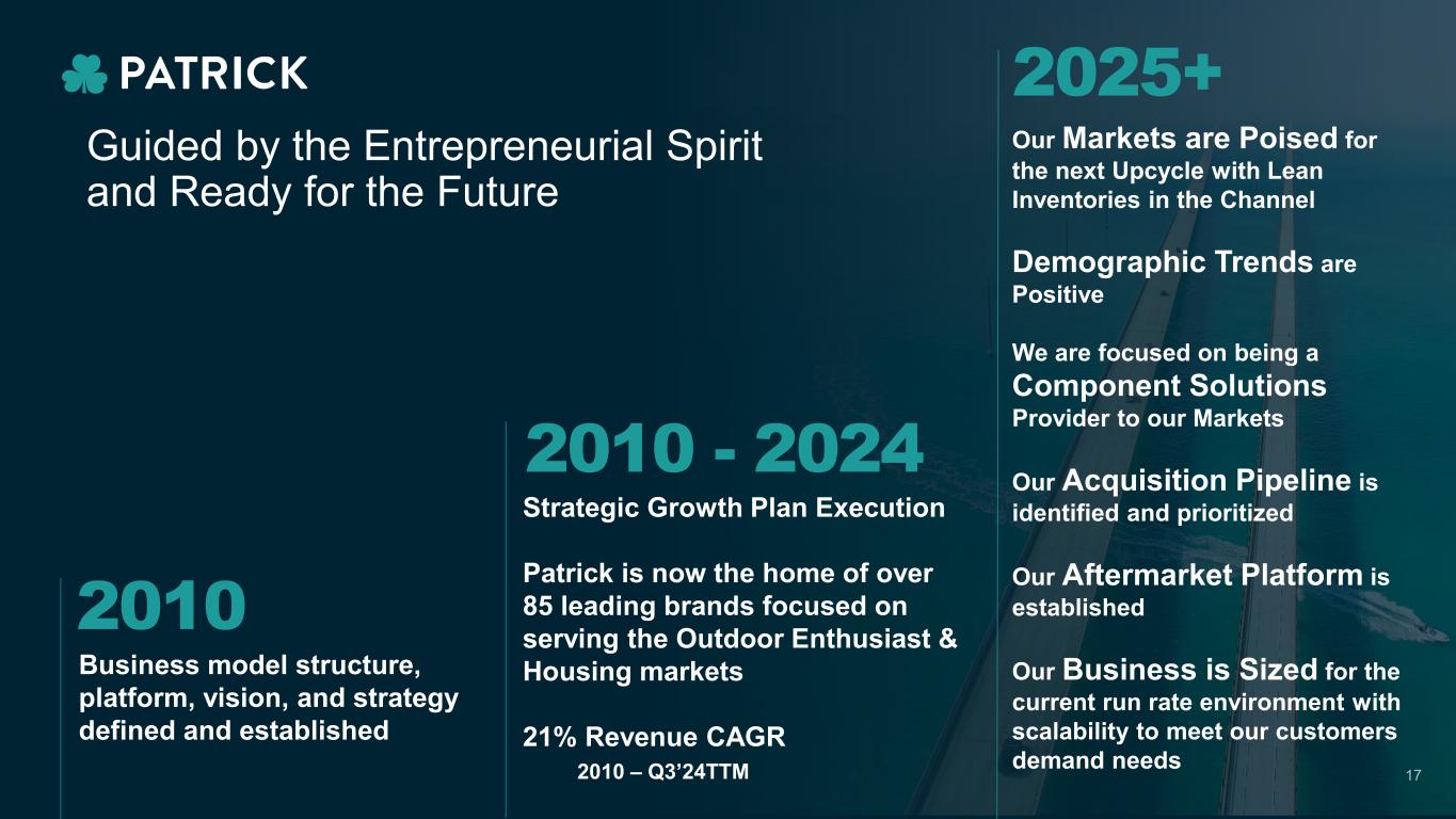 Guided by the Entrepreneurial Spirit and Ready for the Future Business model structure, platform, vision, and strategy defined and established 2010 2010 - 2024 Strategic Growth Plan Execution Patrick is now the home of over 85 leading brands focused on serving the Outdoor Enthusiast & Housing markets 21% Revenue CAGR 2010 – Q3’24TTM 2025+ Our Markets are Poised for the next Upcycle with Lean Inventories in the Channel Demographic Trends are Positive We are focused on being a Component Solutions Provider to our Markets Our Acquisition Pipeline is identified and prioritized Our Aftermarket Platform is established Our Business is Sized for the current run rate environment with scalability to meet our customers demand needs 17