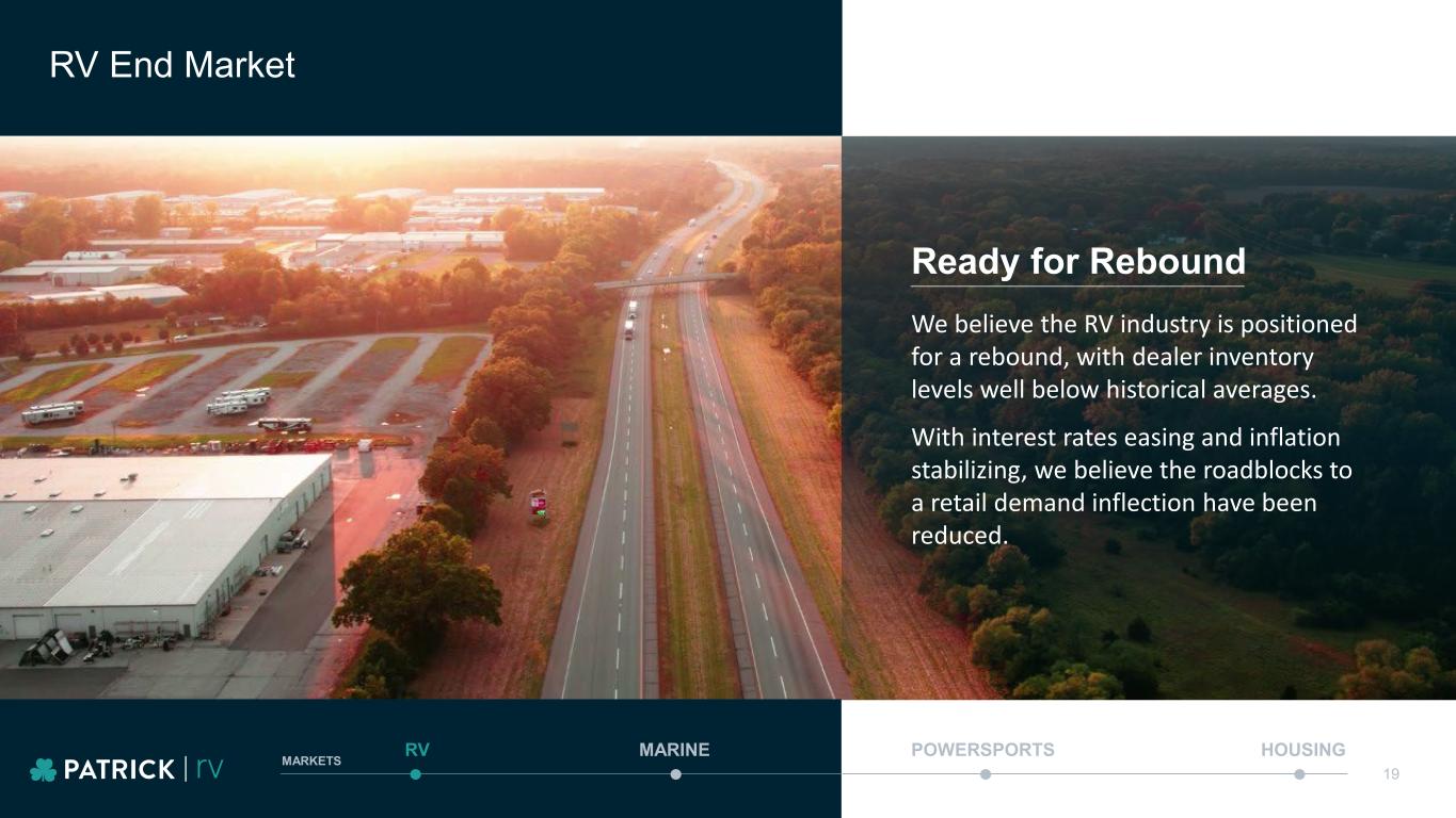 19 MARINE POWERSPORTS HOUSINGRV MARKETS Ready for Rebound We believe the RV industry is positioned for a rebound, with dealer inventory levels well below historical averages. With interest rates easing and inflation stabilizing, we believe the roadblocks to a retail demand inflection have been reduced. 19 RV End Market