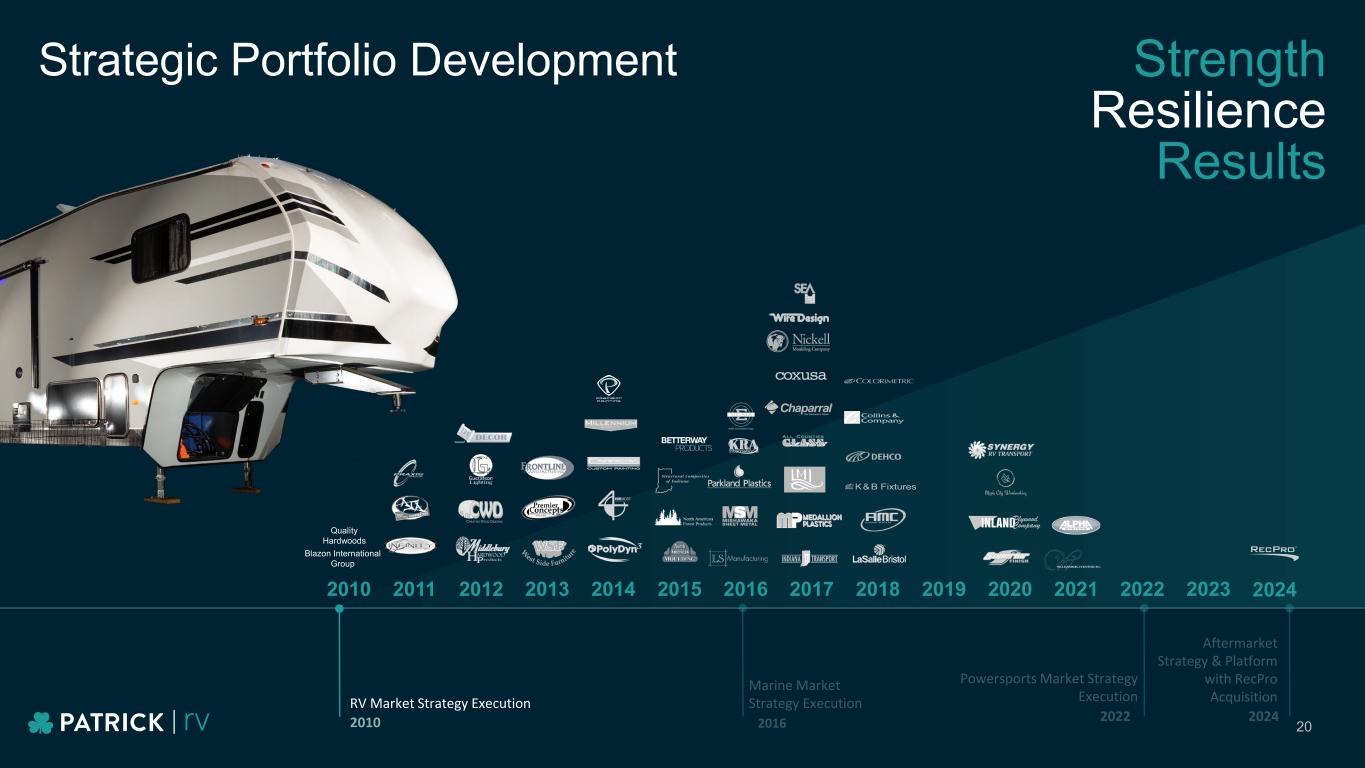 2010 2011 2018 2019 2020 2021 2022 2024 Strategic Portfolio Development RV Market Strategy Execution 2012 2013 2014 2015 2016 2017 2023 20 Strength Resilience Results Quality Hardwoods Blazon International Group