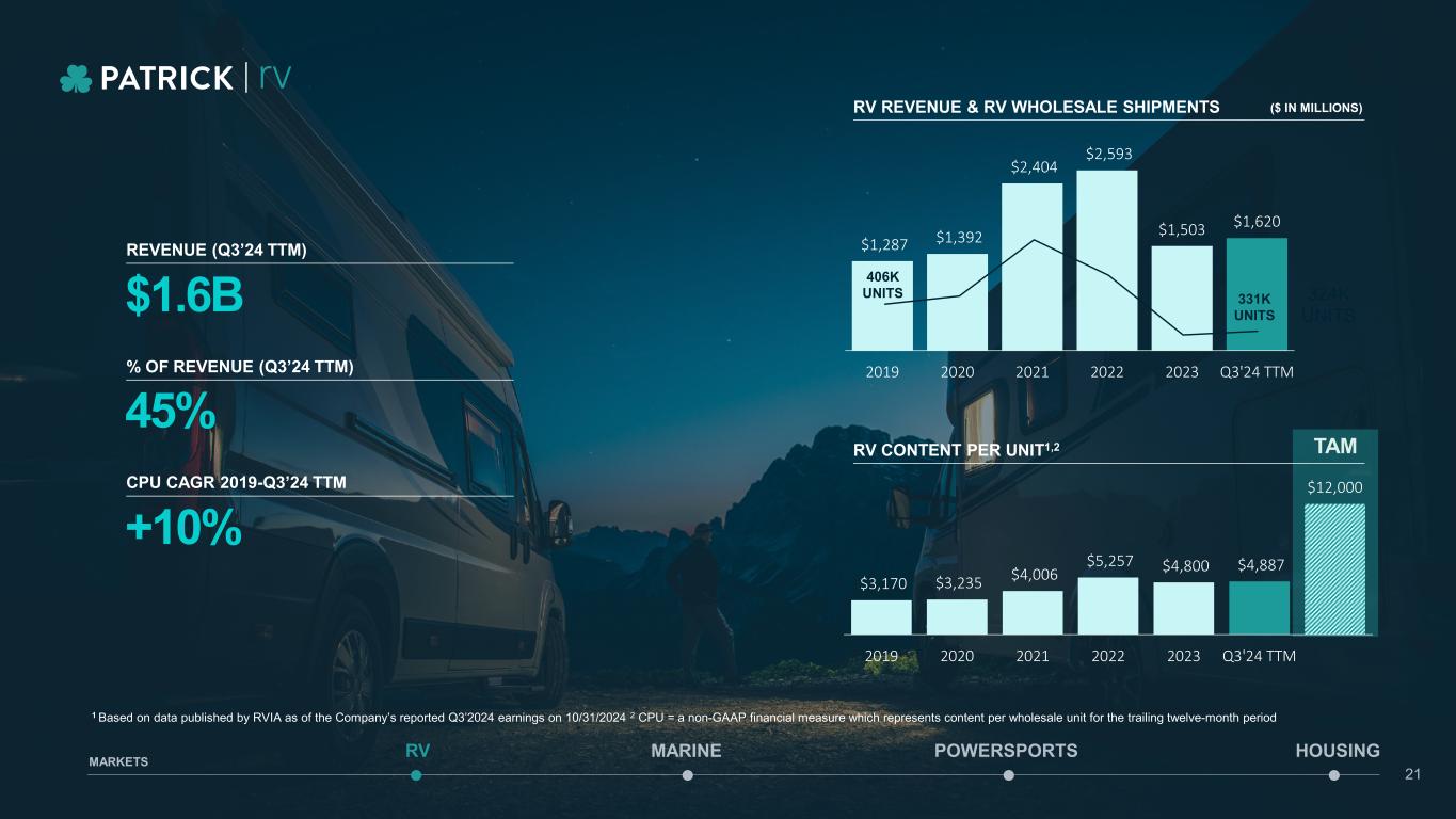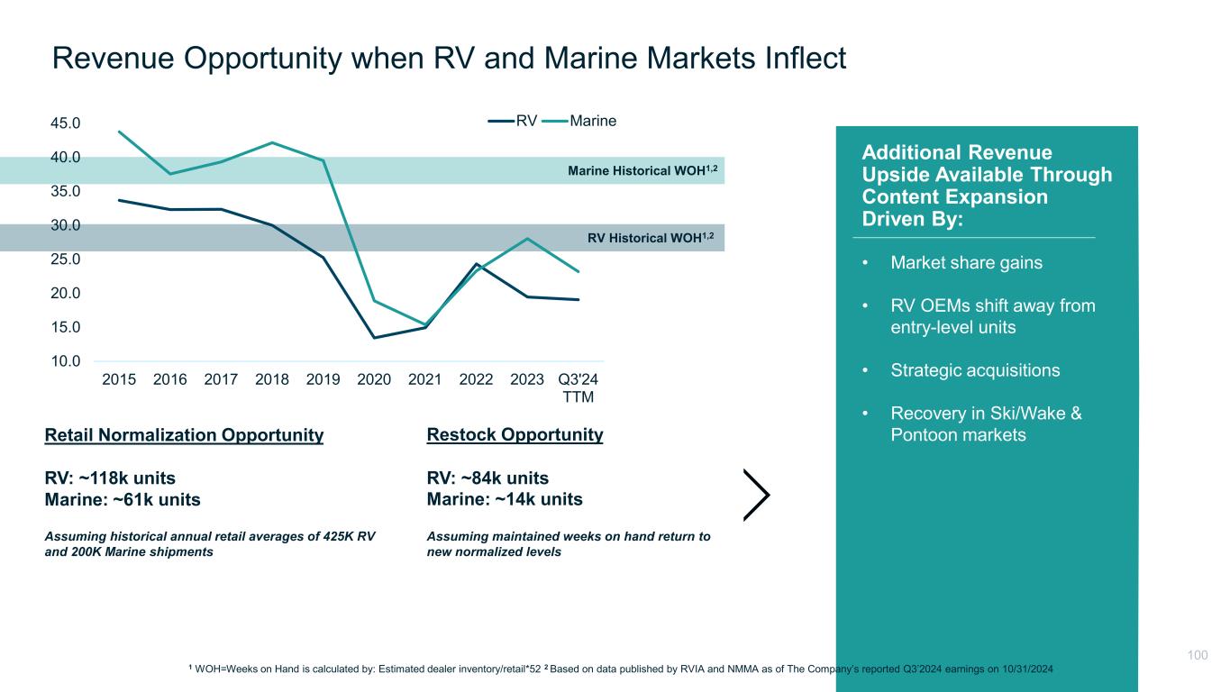 10.0 15.0 20.0 25.0 30.0 35.0 40.0 45.0 2015 2016 2017 2018 2019 2020 2021 2022 2023 Q3'24 TTM RV Marine Restock Opportunity RV: ~84k units Marine: ~14k units Assuming maintained weeks on hand return to new normalized levels Retail Normalization Opportunity RV: ~118k units Marine: ~61k units Assuming historical annual retail averages of 425K RV and 200K Marine shipments Additional Revenue Upside Available Through Content Expansion Driven By: Revenue Opportunity when RV and Marine Markets Inflect RV Historical WOH1,2 Marine Historical WOH1,2 1 WOH=Weeks on Hand is calculated by: Estimated dealer inventory/retail*52 2 Based on data published by RVIA and NMMA as of The Company’s reported Q3’2024 earnings on 10/31/2024 • Market share gains • RV OEMs shift away from entry-level units • Strategic acquisitions • Recovery in Ski/Wake & Pontoon markets 100