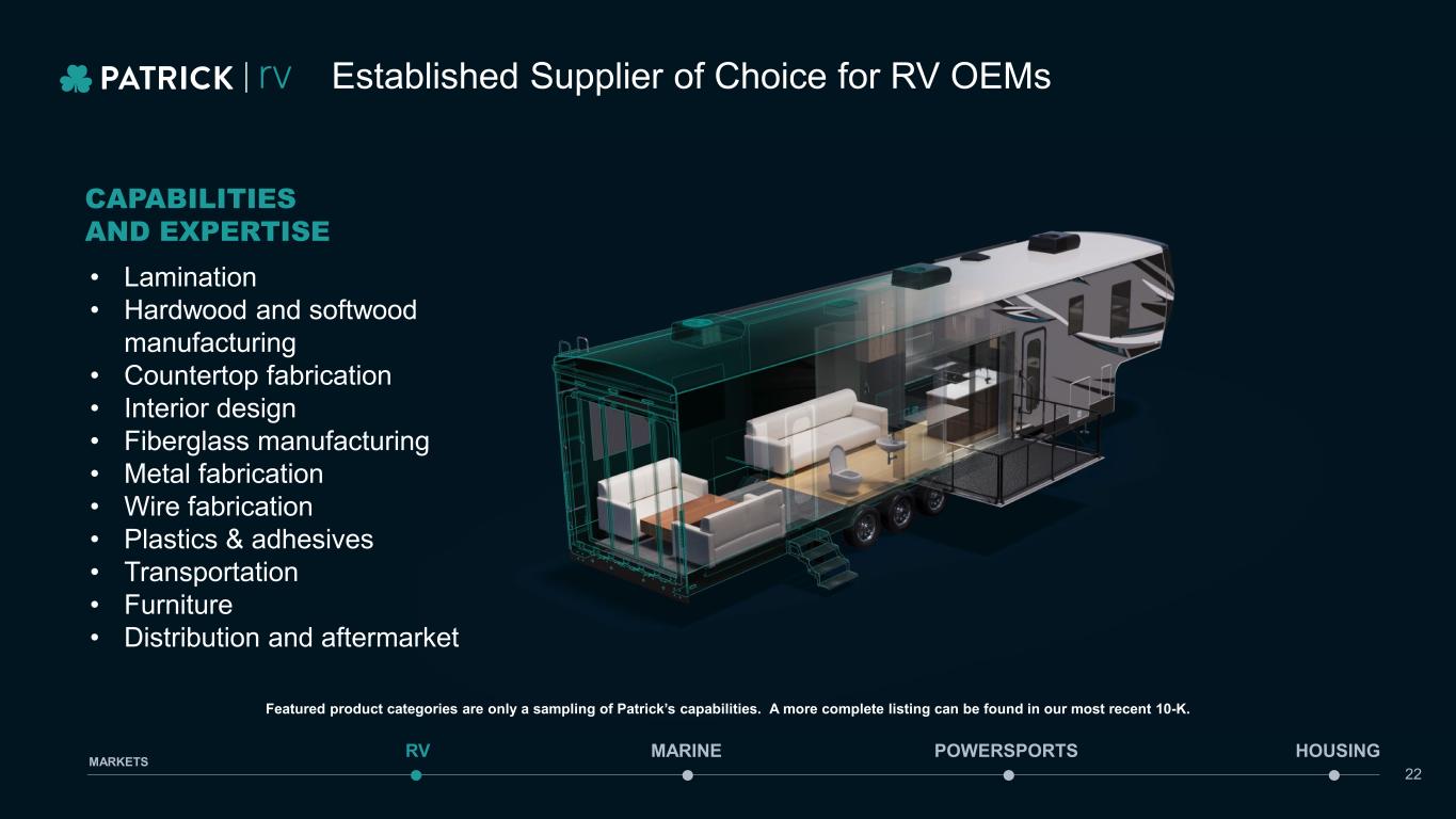 TAM $1.6B REVENUE (Q3’24 TTM) % OF REVENUE (Q3’24 TTM) 45% CPU CAGR 2019-Q3’24 TTM +10% RV REVENUE & RV WHOLESALE SHIPMENTS ($ IN MILLIONS) $1,287 $1,392 $2,404 $2,593 $1,503 $1,620 2019 2020 2021 2022 2023 Q3'24 TTM RV CONTENT PER UNIT1,2 $3,170 $3,235 $4,006 $5,257 $4,800 $4,887 $12,000 2019 2020 2021 2022 2023 Q3'24 TTM 1 Based on data published by RVIA as of the Company’s reported Q3’2024 earnings on 10/31/2024 2 CPU = a non-GAAP financial measure which represents content per wholesale unit for the trailing twelve-month period 406K UNITS 324K UNITS 331K UNITS 21 MARINE POWERSPORTS HOUSINGRV MARKETS