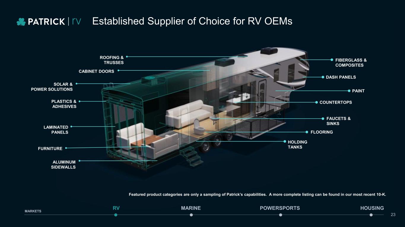 CAPABILITIES AND EXPERTISE • Lamination • Hardwood and softwood manufacturing • Countertop fabrication • Interior design • Fiberglass manufacturing • Metal fabrication • Wire fabrication • Plastics & adhesives • Transportation • Furniture • Distribution and aftermarket Featured product categories are only a sampling of Patrick’s capabilities. A more complete listing can be found in our most recent 10-K. Established Supplier of Choice for RV OEMs 22 MARINE POWERSPORTS HOUSINGRV MARKETS