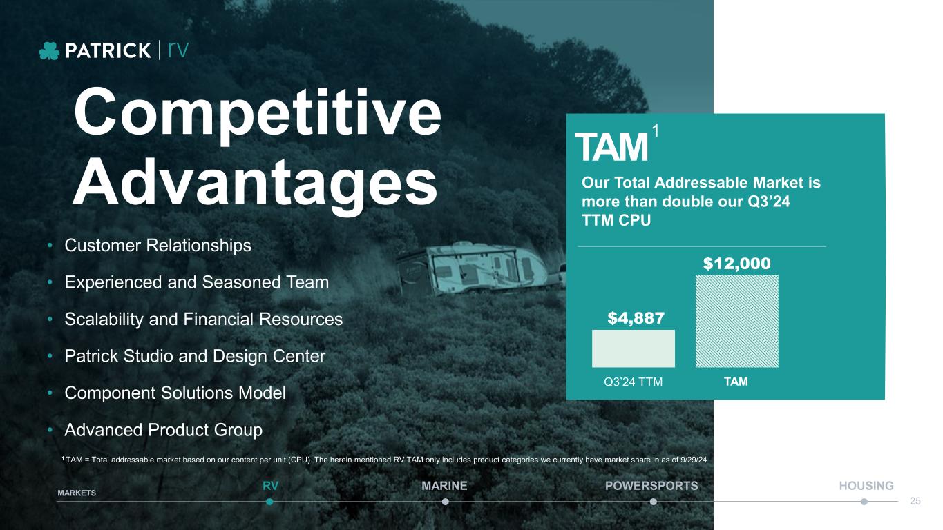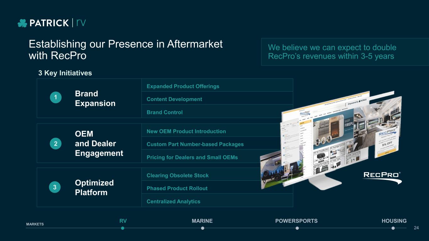 Establishing our Presence in Aftermarket with RecPro 24 MARINE POWERSPORTS HOUSINGRV MARKETS Brand Expansion Expanded Product Offerings Content Development Brand Control OEM and Dealer Engagement New OEM Product Introduction Custom Part Number-based Packages Pricing for Dealers and Small OEMs Optimized Platform Clearing Obsolete Stock Phased Product Rollout Centralized Analytics 1 2 3 3 Key Initiatives We believe we can expect to double RecPro’s revenues within 3-5 years
