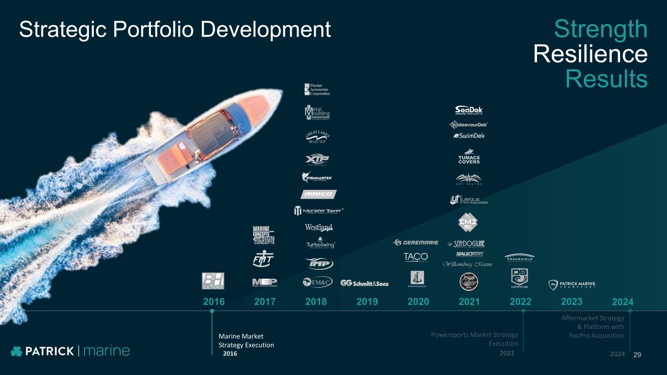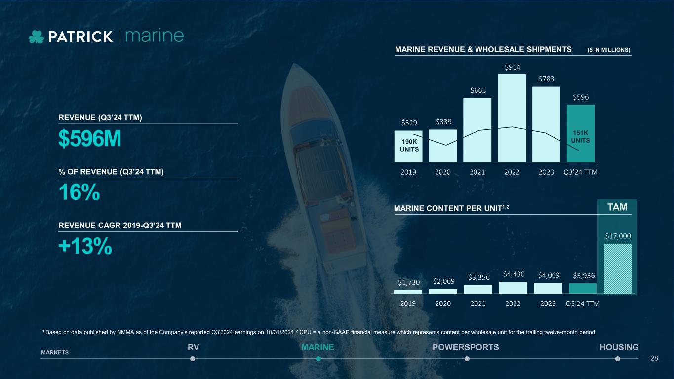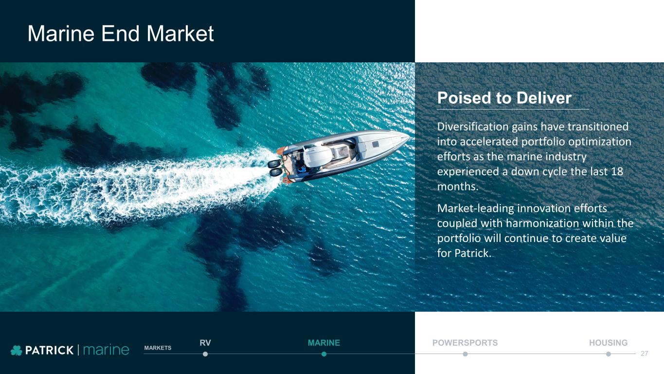 Marine End Market MARINE POWERSPORTS HOUSINGRV MARKETS 27 Poised to Deliver Diversification gains have transitioned into accelerated portfolio optimization efforts as the marine industry experienced a down cycle the last 18 months. Market-leading innovation efforts coupled with harmonization within the portfolio will continue to create value for Patrick.