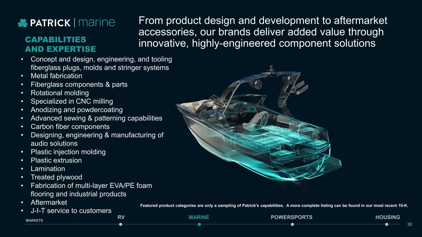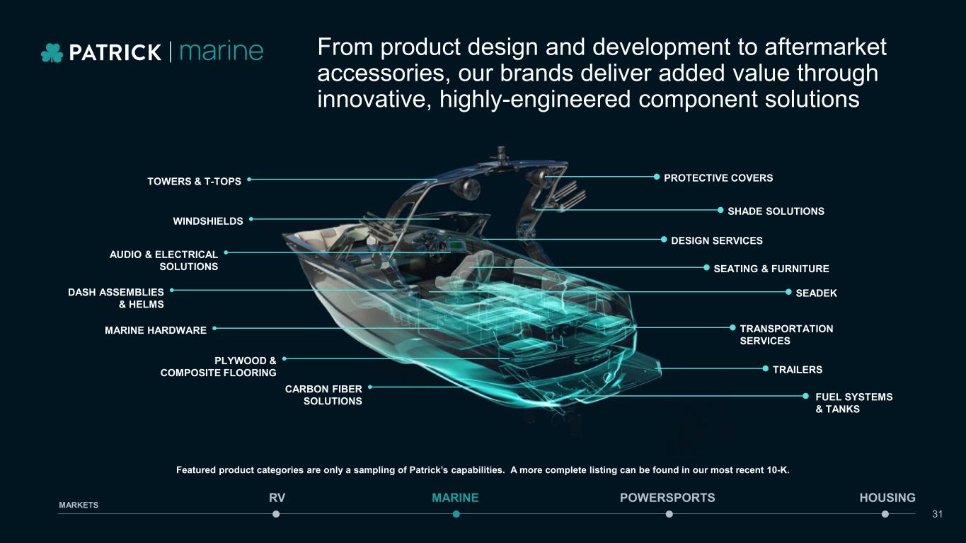 CAPABILITIES AND EXPERTISE • Concept and design, engineering, and tooling fiberglass plugs, molds and stringer systems • Metal fabrication • Fiberglass components & parts • Rotational molding • Specialized in CNC milling • Anodizing and powdercoating • Advanced sewing & patterning capabilities • Carbon fiber components • Designing, engineering & manufacturing of audio solutions • Plastic injection molding • Plastic extrusion • Lamination • Treated plywood • Fabrication of multi-layer EVA/PE foam flooring and industrial products • Aftermarket • J-I-T service to customers From product design and development to aftermarket accessories, our brands deliver added value through innovative, highly-engineered component solutions MARINE POWERSPORTS HOUSINGRV MARKETS 30 Featured product categories are only a sampling of Patrick’s capabilities. A more complete listing can be found in our most recent 10-K.