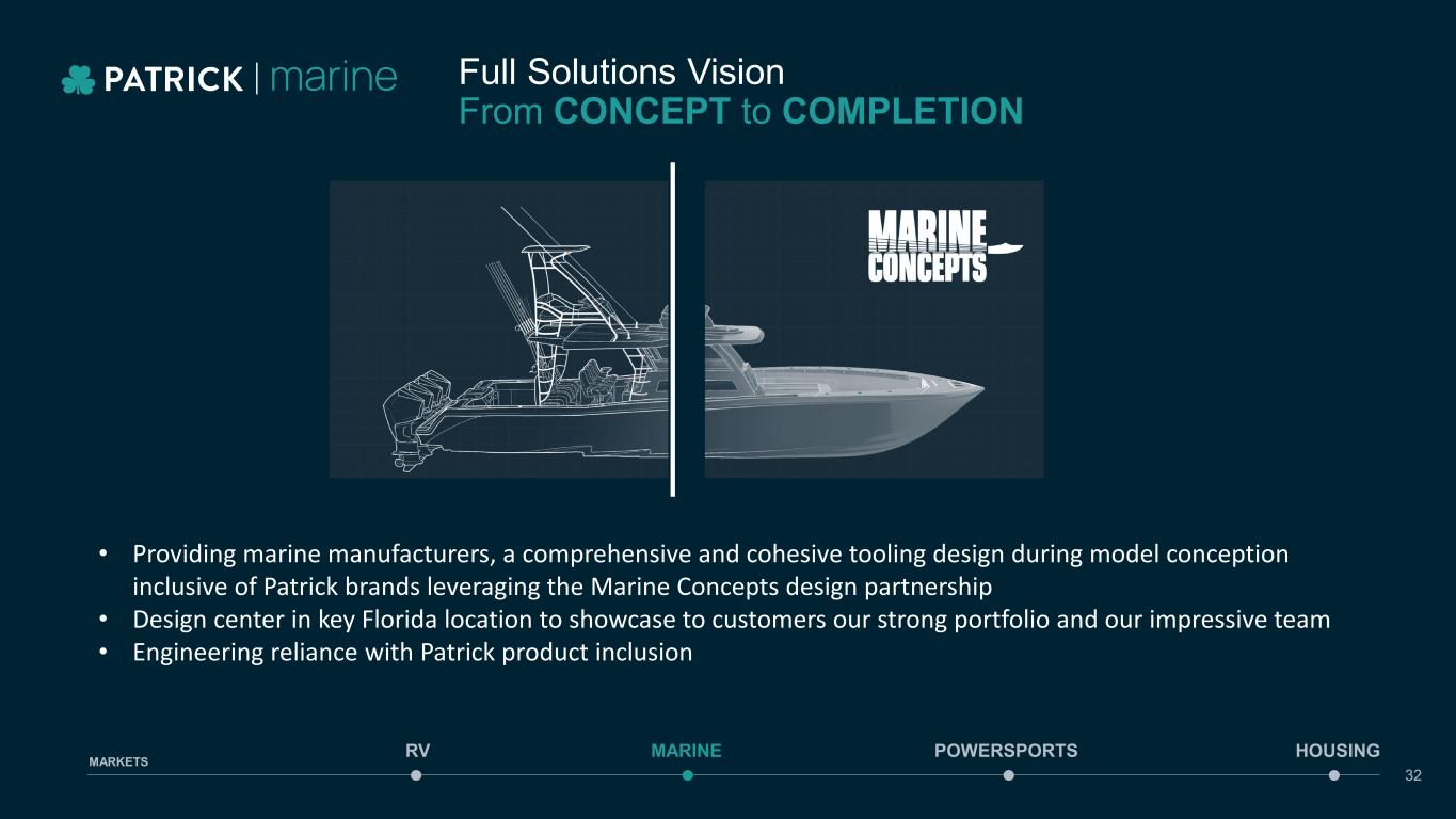 MARINE POWERSPORTS HOUSING MARKETS 31 From product design and development to aftermarket accessories, our brands deliver added value through innovative, highly-engineered component solutions AUDIO & ELECTRICAL SOLUTIONS SEATING & FURNITURE SEADEK FUEL SYSTEMS & TANKS DASH ASSEMBLIES & HELMS PLYWOOD & COMPOSITE FLOORING WINDSHIELDS MARINE HARDWARE TOWERS & T-TOPS DESIGN SERVICES SHADE SOLUTIONS TRANSPORTATION SERVICES TRAILERS CARBON FIBER SOLUTIONS PROTECTIVE COVERS RV Featured product categories are only a sampling of Patrick’s capabilities. A more complete listing can be found in our most recent 10-K.