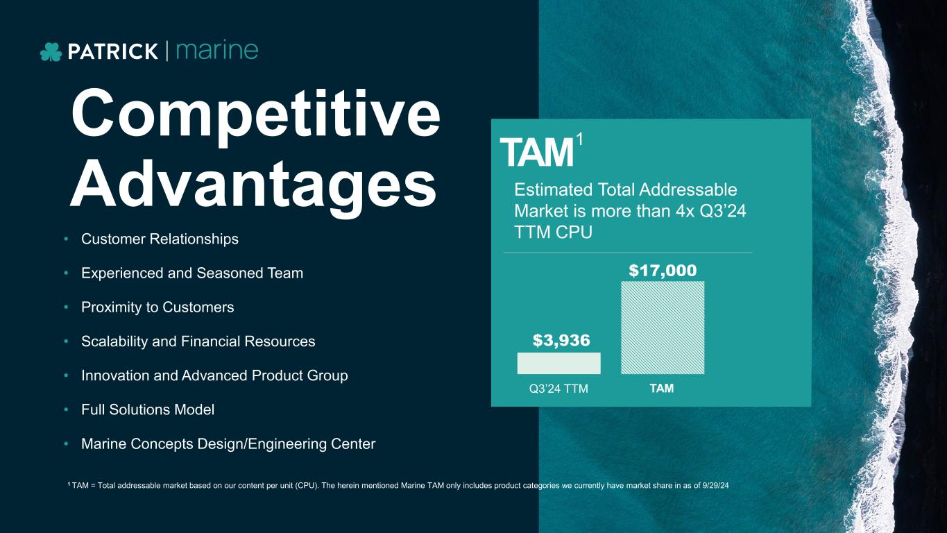 • Customer Relationships • Experienced and Seasoned Team • Proximity to Customers • Scalability and Financial Resources • Innovation and Advanced Product Group • Full Solutions Model • Marine Concepts Design/Engineering Center Competitive Advantages TAM Q3’24 TTM $3,936 $17,000 TAM Estimated Total Addressable Market is more than 4x Q3’24 TTM CPU 1 TAM = Total addressable market based on our content per unit (CPU). The herein mentioned Marine TAM only includes product categories we currently have market share in as of 9/29/24 1