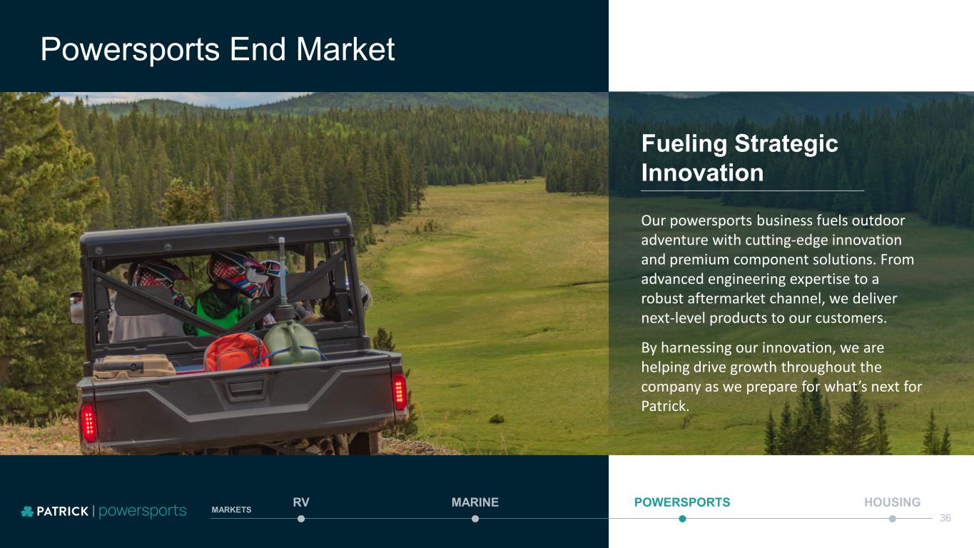 Fueling Strategic Innovation Powersports End Market MARINE POWERSPORTS HOUSINGRV MARKETS 36 Our powersports business fuels outdoor adventure with cutting-edge innovation and premium component solutions. From advanced engineering expertise to a robust aftermarket channel, we deliver next-level products to our customers. By harnessing our innovation, we are helping drive growth throughout the company as we prepare for what’s next for Patrick.