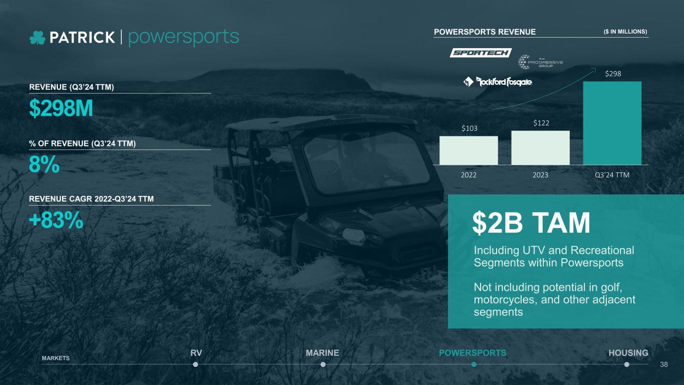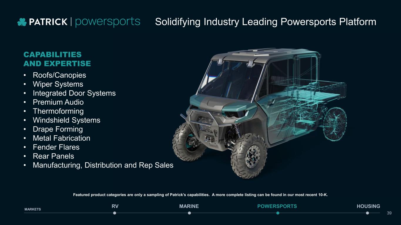 $298M REVENUE (Q3’24 TTM) % OF REVENUE (Q3’24 TTM) 8% REVENUE CAGR 2022-Q3’24 TTM +83% POWERSPORTS REVENUE ($ IN MILLIONS) $103 $122 $298 2022 2023 Q3'24 TTM $2B TAM Including UTV and Recreational Segments within Powersports Not including potential in golf, motorcycles, and other adjacent segments MARINE POWERSPORTS HOUSINGRV MARKETS 38