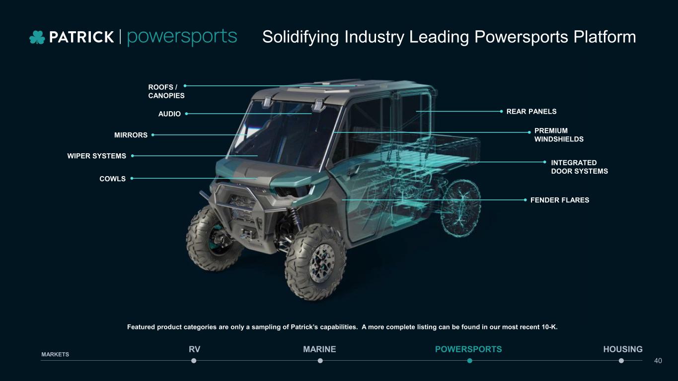 CAPABILITIES AND EXPERTISE • Roofs/Canopies • Wiper Systems • Integrated Door Systems • Premium Audio • Thermoforming • Windshield Systems • Drape Forming • Metal Fabrication • Fender Flares • Rear Panels • Manufacturing, Distribution and Rep Sales MARINE POWERSPORTS HOUSINGRV MARKETS 39 Solidifying Industry Leading Powersports Platform Featured product categories are only a sampling of Patrick’s capabilities. A more complete listing can be found in our most recent 10-K.