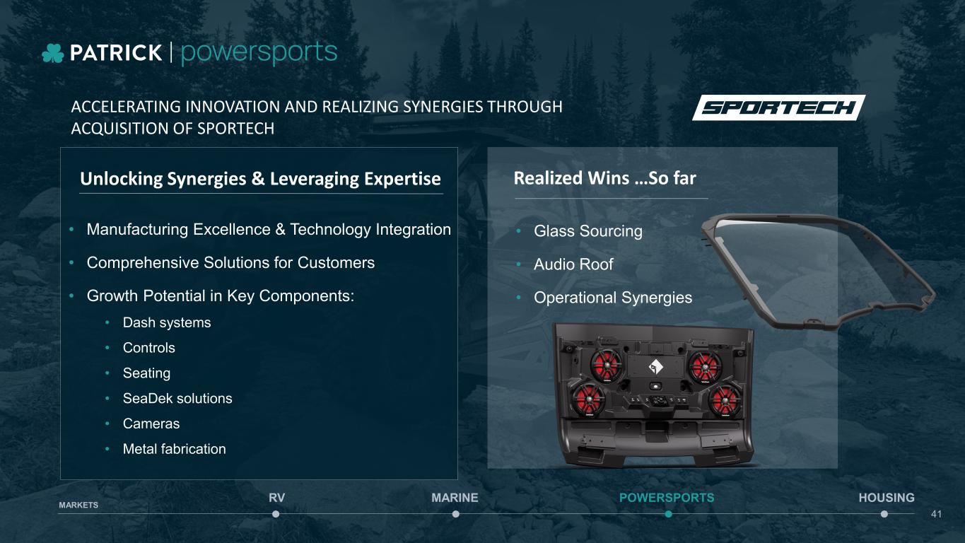 Solidifying Industry Leading Powersports Platform Featured product categories are only a sampling of Patrick’s capabilities. A more complete listing can be found in our most recent 10-K. ROOFS / CANOPIES MIRRORS REAR PANELS PREMIUM WINDSHIELDS INTEGRATED DOOR SYSTEMS AUDIO COWLS FENDER FLARES WIPER SYSTEMS MARINE POWERSPORTS HOUSINGRV MARKETS 40