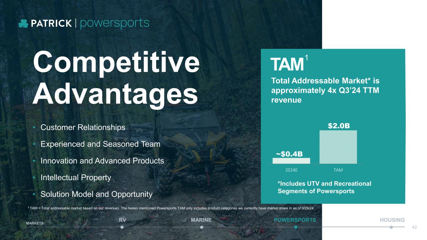 ACCELERATING INNOVATION AND REALIZING SYNERGIES THROUGH ACQUISITION OF SPORTECH Unlocking Synergies & Leveraging Expertise Realized Wins …So far • Glass Sourcing • Audio Roof • Operational Synergies • Manufacturing Excellence & Technology Integration • Comprehensive Solutions for Customers • Growth Potential in Key Components: • Dash systems • Controls • Seating • SeaDek solutions • Cameras • Metal fabrication MARINE POWERSPORTS HOUSINGRV MARKETS 41