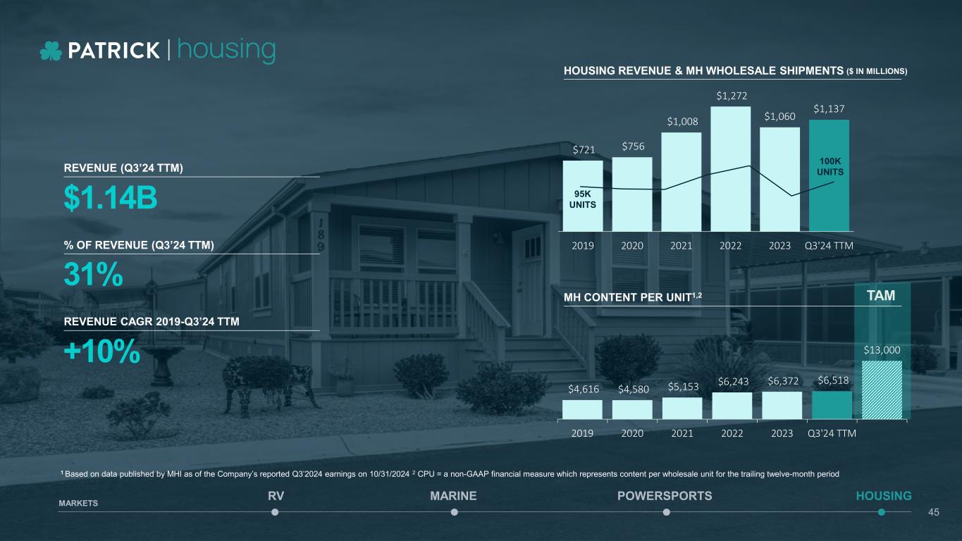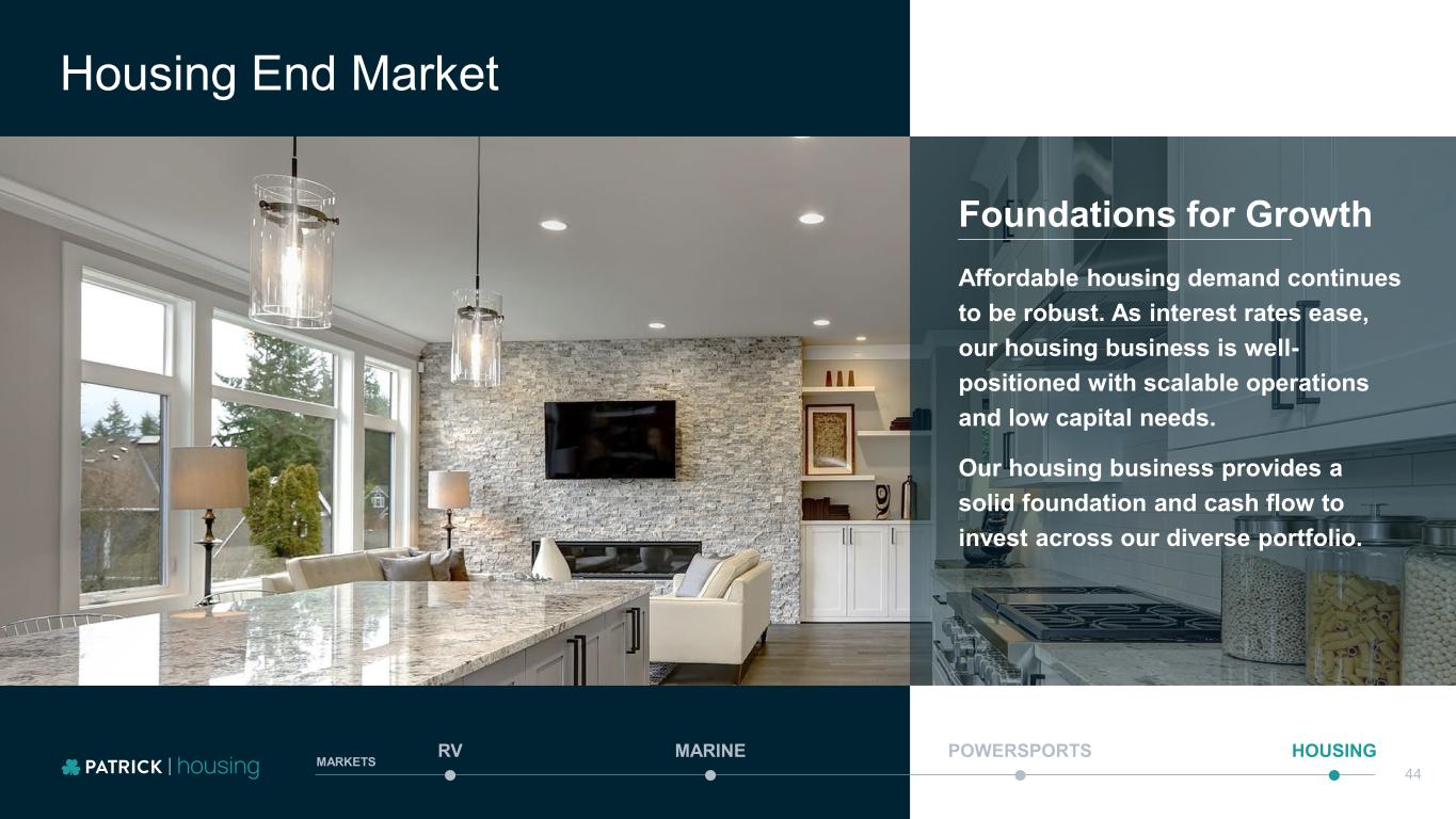 Housing End Market MARINE POWERSPORTS HOUSINGRV MARKETS 44 Foundations for Growth Affordable housing demand continues to be robust. As interest rates ease, our housing business is well- positioned with scalable operations and low capital needs. Our housing business provides a solid foundation and cash flow to invest across our diverse portfolio.