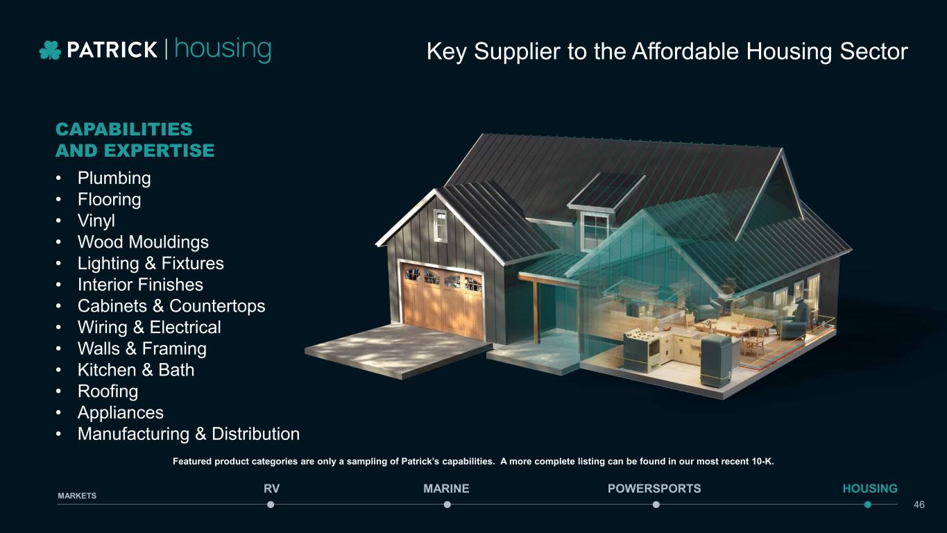 HOUSING REVENUE & MH WHOLESALE SHIPMENTS ($ IN MILLIONS) $721 $756 $1,008 $1,272 $1,060 $1,137 2019 2020 2021 2022 2023 Q3'24 TTM MH CONTENT PER UNIT1,2 $4,616 $4,580 $5,153 $6,243 $6,372 $6,518 $13,000 2019 2020 2021 2022 2023 Q3'24 TTM $1.14B REVENUE (Q3’24 TTM) % OF REVENUE (Q3’24 TTM) 31% REVENUE CAGR 2019-Q3’24 TTM +10% MARINE POWERSPORTS HOUSINGRV MARKETS 95K UNITS 100K UNITS TAM 45 1 Based on data published by MHI as of the Company’s reported Q3’2024 earnings on 10/31/2024 2 CPU = a non-GAAP financial measure which represents content per wholesale unit for the trailing twelve-month period