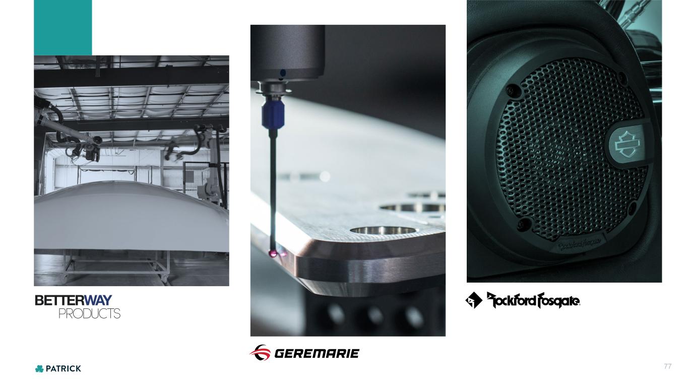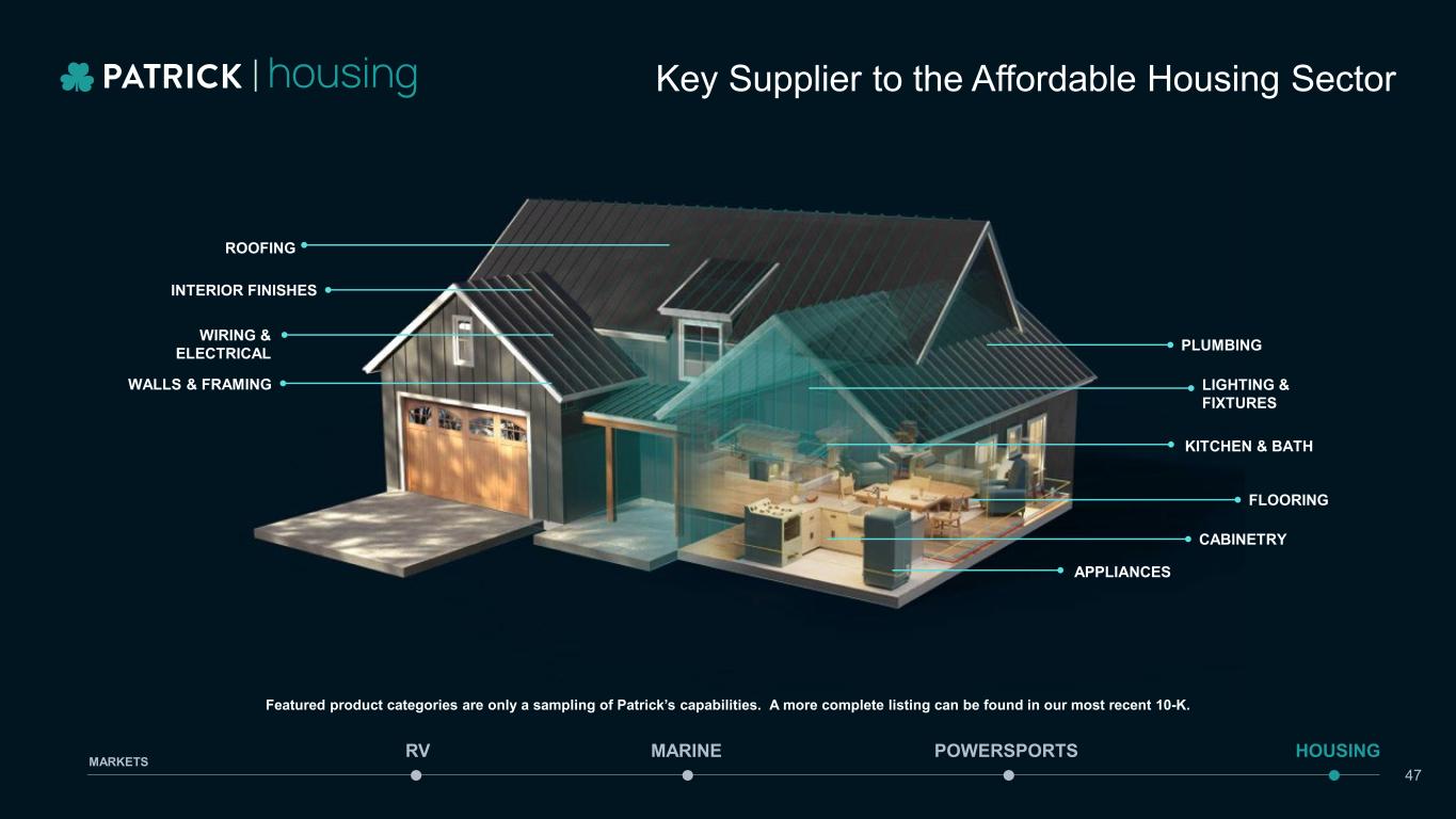 CAPABILITIES AND EXPERTISE • Plumbing • Flooring • Vinyl • Wood Mouldings • Lighting & Fixtures • Interior Finishes • Cabinets & Countertops • Wiring & Electrical • Walls & Framing • Kitchen & Bath • Roofing • Appliances • Manufacturing & Distribution Key Supplier to the Affordable Housing Sector MARINE POWERSPORTS HOUSINGRV MARKETS 46 Featured product categories are only a sampling of Patrick’s capabilities. A more complete listing can be found in our most recent 10-K.