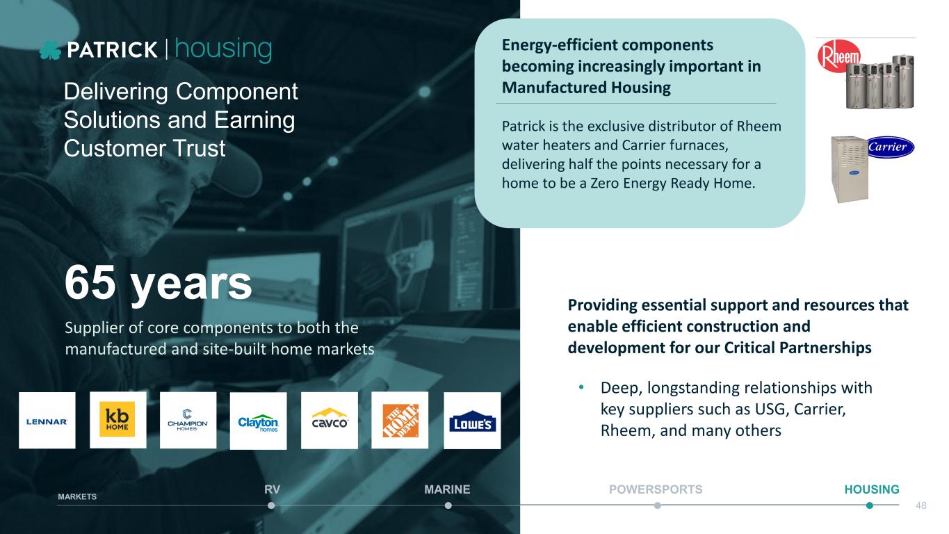 • Deep, longstanding relationships with key suppliers such as USG, Carrier, Rheem, and many others Providing essential support and resources that enable efficient construction and development for our Critical Partnerships Delivering Component Solutions and Earning Customer Trust Supplier of core components to both the manufactured and site-built home markets 65 years Patrick is the exclusive distributor of Rheem water heaters and Carrier furnaces, delivering half the points necessary for a home to be a Zero Energy Ready Home. Energy-efficient components becoming increasingly important in Manufactured Housing MARINE POWERSPORTS HOUSINGRV MARKETS 48