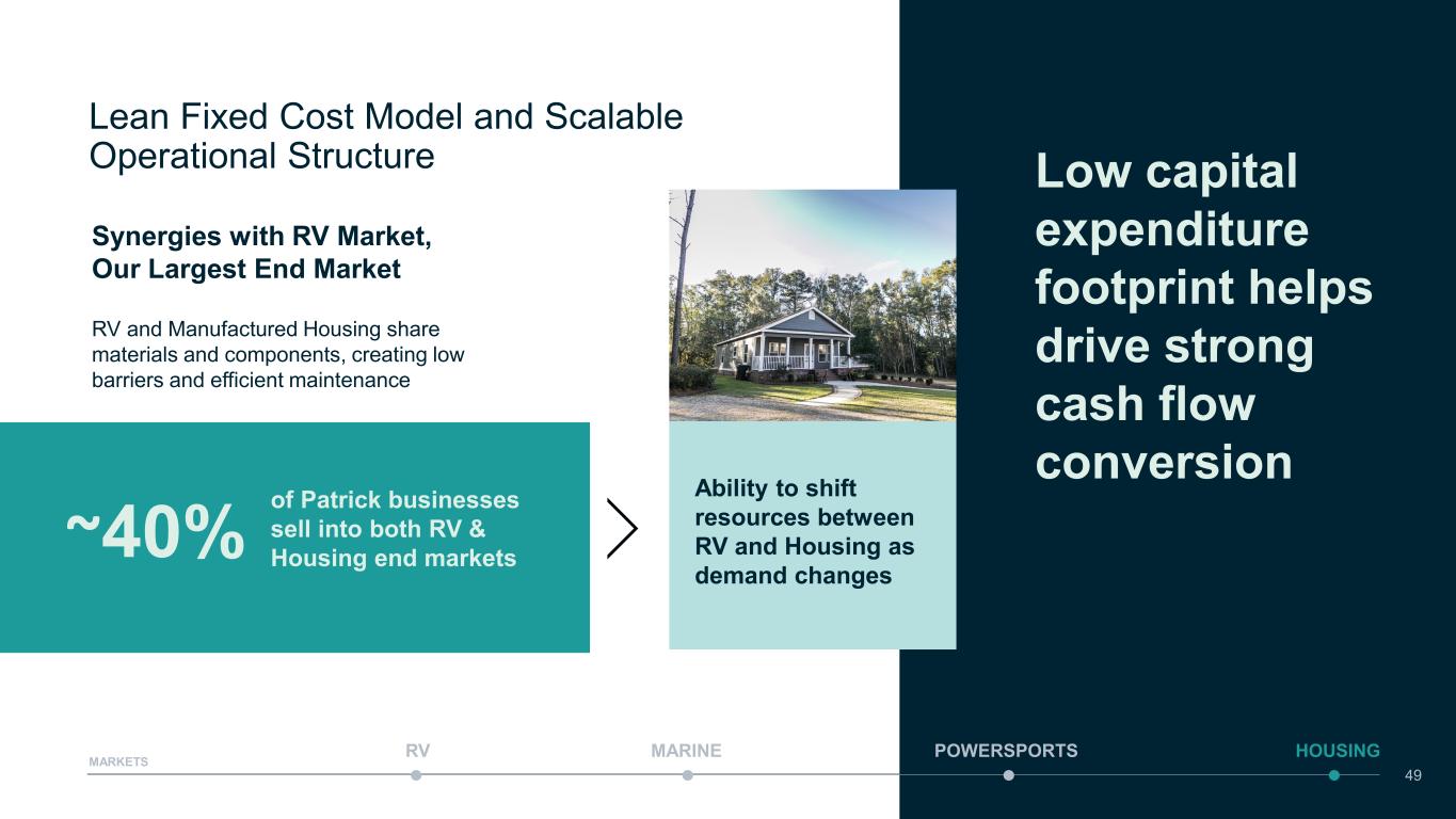 Lean Fixed Cost Model and Scalable Operational Structure RV and Manufactured Housing share materials and components, creating low barriers and efficient maintenance of Patrick businesses sell into both RV & Housing end markets~40% Synergies with RV Market, Our Largest End Market Ability to shift resources between RV and Housing as demand changes Low capital expenditure footprint helps drive strong cash flow conversion MARINE POWERSPORTS HOUSINGRV MARKETS 49