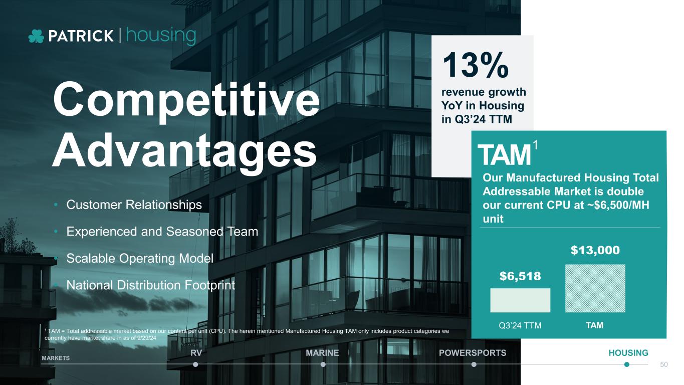 • Customer Relationships • Experienced and Seasoned Team • Scalable Operating Model • National Distribution Footprint Competitive Advantages 13% revenue growth YoY in Housing in Q3’24 TTM TAM Our Manufactured Housing Total Addressable Market is double our current CPU at ~$6,500/MH unit Q3’24 TTM $6,518 $13,000 TAM MARINE POWERSPORTS HOUSINGRV MARKETS 50 1 TAM = Total addressable market based on our content per unit (CPU). The herein mentioned Manufactured Housing TAM only includes product categories we currently have market share in as of 9/29/24 1