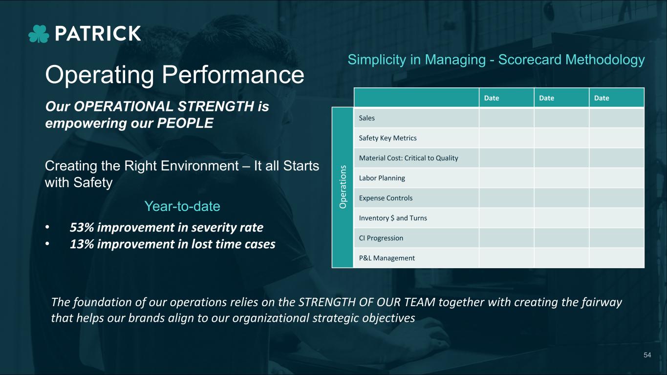 Our OPERATIONAL STRENGTH is empowering our PEOPLE Date Date Date Sales Safety Key Metrics Material Cost: Critical to Quality Labor Planning Expense Controls Inventory $ and Turns CI Progression P&L Management Operating Performance Creating the Right Environment – It all Starts with Safety • 53% improvement in severity rate • 13% improvement in lost time cases Year-to-date Simplicity in Managing - Scorecard Methodology O pe ra tio ns The foundation of our operations relies on the STRENGTH OF OUR TEAM together with creating the fairway that helps our brands align to our organizational strategic objectives 54