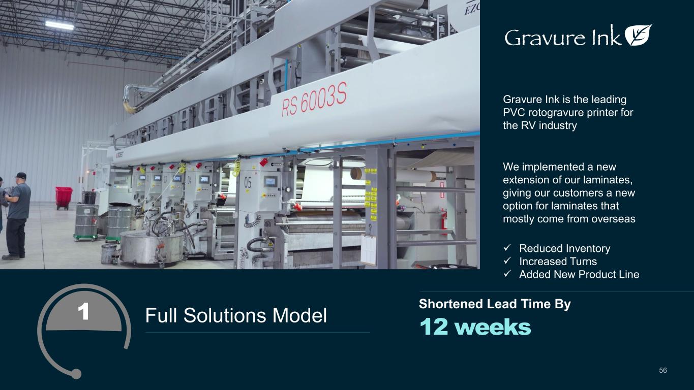 Full Solutions Model We implemented a new extension of our laminates, giving our customers a new option for laminates that mostly come from overseas 12 weeks Shortened Lead Time By  Reduced Inventory  Increased Turns  Added New Product Line 1 56 Gravure Ink is the leading PVC rotogravure printer for the RV industry