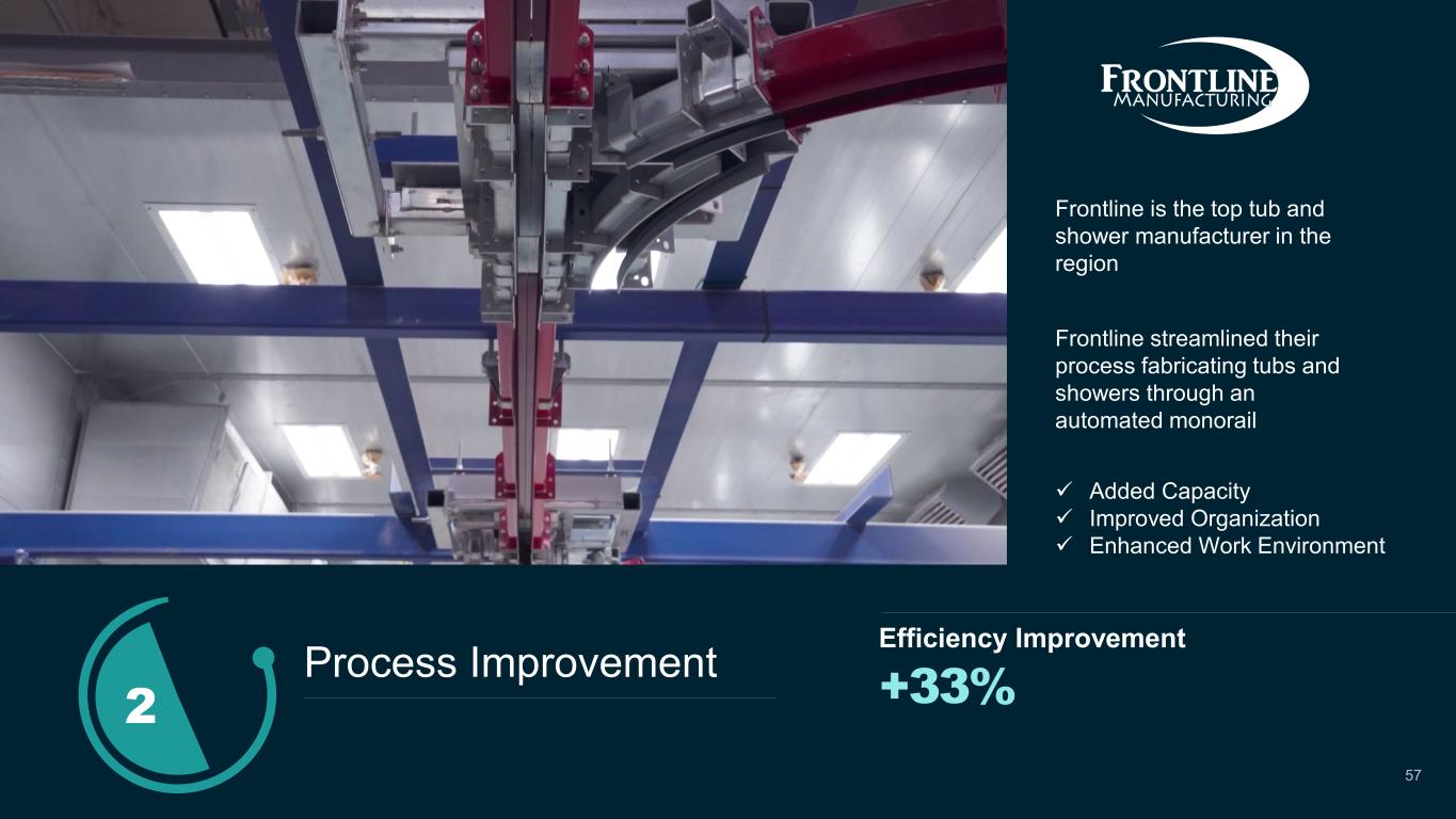 Frontline streamlined their process fabricating tubs and showers through an automated monorail +33% Efficiency Improvement  Added Capacity  Improved Organization  Enhanced Work Environment 2 Process Improvement Frontline is the top tub and shower manufacturer in the region 57