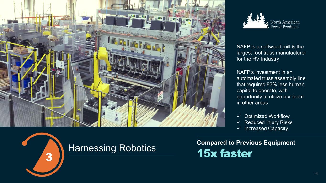 NAFP’s investment in an automated truss assembly line that required 83% less human capital to operate, with opportunity to utilize our team in other areas 15x faster Compared to Previous Equipment  Optimized Workflow  Reduced Injury Risks  Increased Capacity Harnessing Robotics 3 NAFP is a softwood mill & the largest roof truss manufacturer for the RV Industry 58