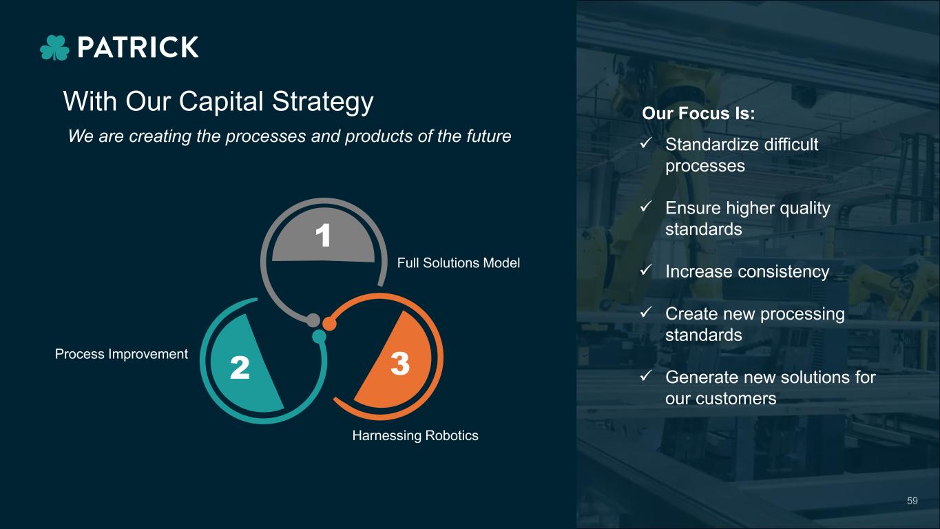 With Our Capital Strategy  Standardize difficult processes  Ensure higher quality standards  Increase consistency  Create new processing standards  Generate new solutions for our customers We are creating the processes and products of the future Our Focus Is: Harnessing Robotics Process Improvement Full Solutions Model 1 2 3 59
