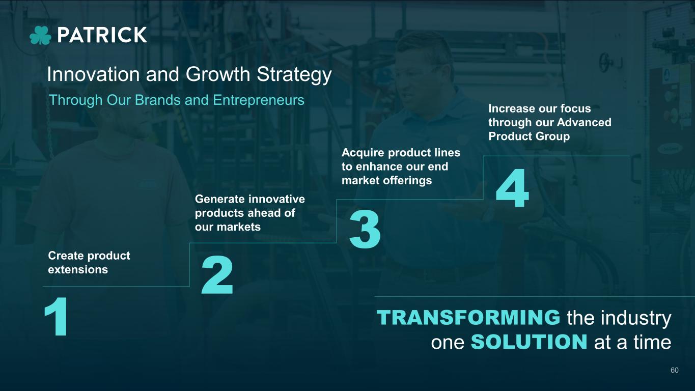 Generate innovative products ahead of our markets Increase our focus through our Advanced Product Group Acquire product lines to enhance our end market offerings Create product extensions 1 2 3 4 Innovation and Growth Strategy Through Our Brands and Entrepreneurs TRANSFORMING the industry one SOLUTION at a time 60