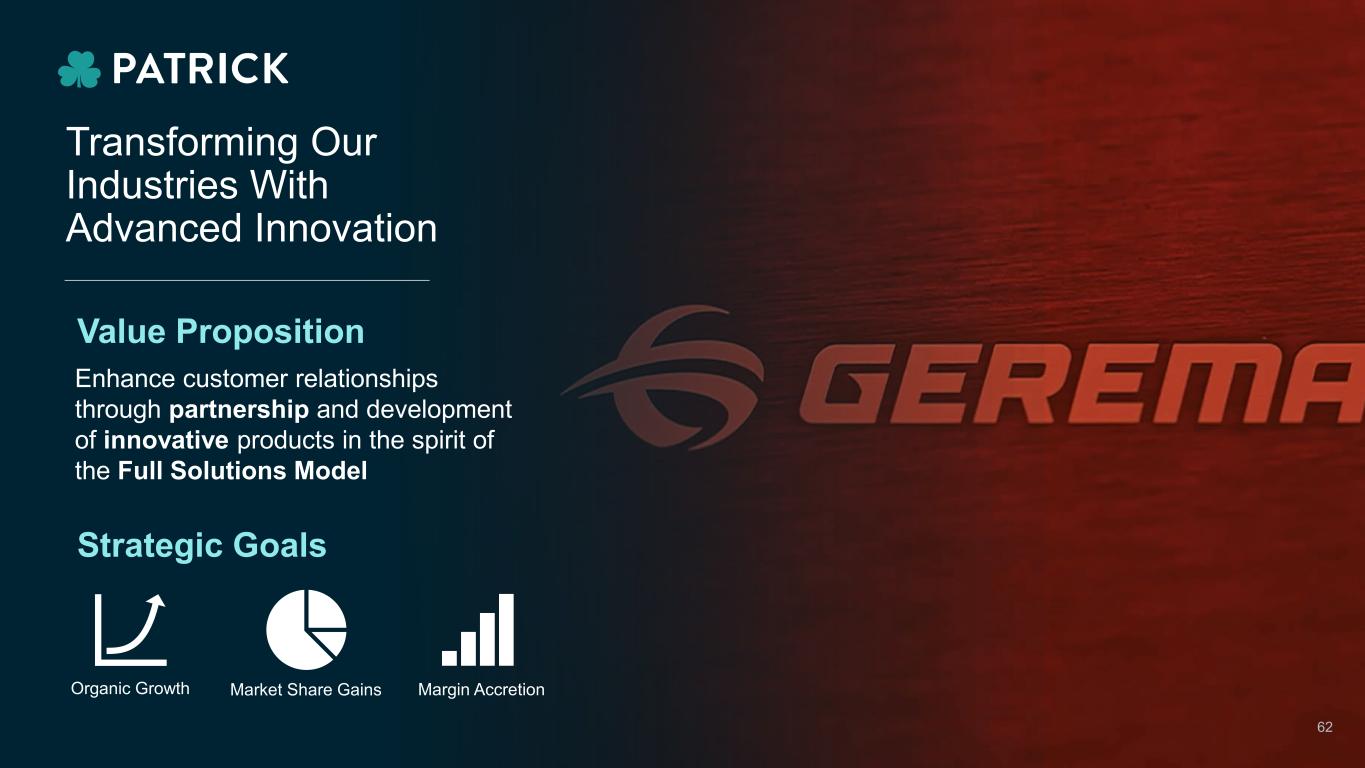 Value Proposition Transforming Our Industries With Advanced Innovation Enhance customer relationships through partnership and development of innovative products in the spirit of the Full Solutions Model Organic Growth Strategic Goals Market Share Gains Margin Accretion 62