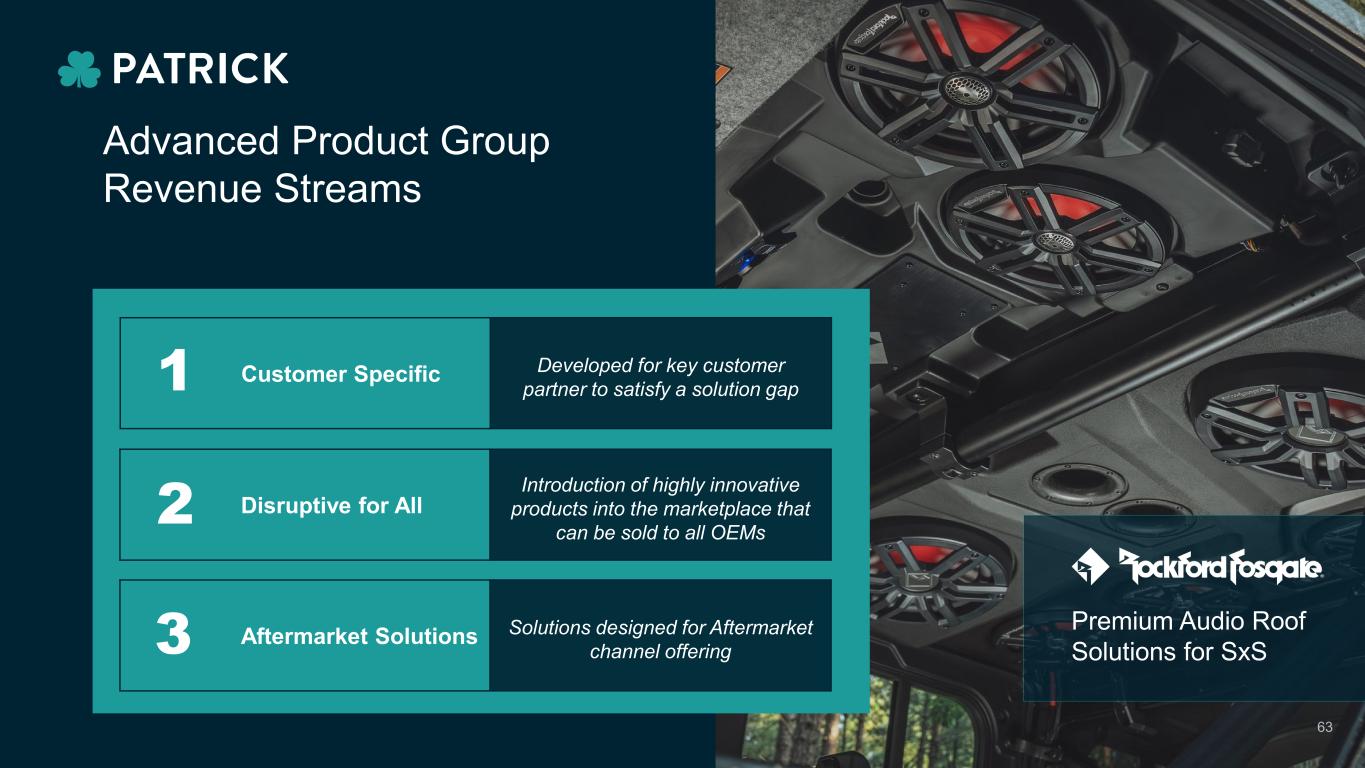 Customer Specific Developed for key customer partner to satisfy a solution gap Disruptive for All Introduction of highly innovative products into the marketplace that can be sold to all OEMs Aftermarket Solutions Solutions designed for Aftermarket channel offering 1 2 3 Advanced Product Group Revenue Streams 63 Premium Audio Roof Solutions for SxS