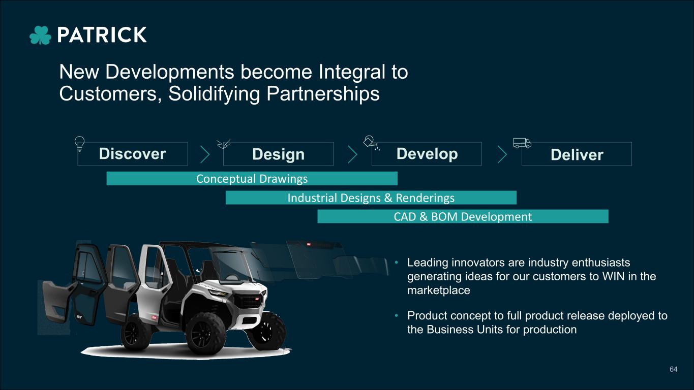 • Leading innovators are industry enthusiasts generating ideas for our customers to WIN in the marketplace • Product concept to full product release deployed to the Business Units for production Discover Design Develop Deliver New Developments become Integral to Customers, Solidifying Partnerships Conceptual Drawings Industrial Designs & Renderings CAD & BOM Development 64