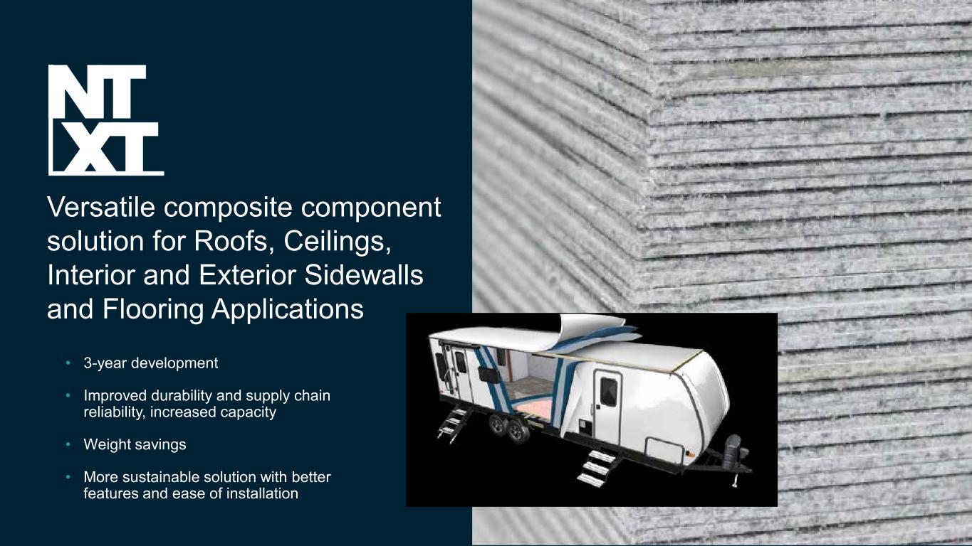 66 Versatile composite component solution for Roofs, Ceilings, Interior and Exterior Sidewalls and Flooring Applications • 3-year development • Improved durability and supply chain reliability, increased capacity • Weight savings • More sustainable solution with better features and ease of installation
