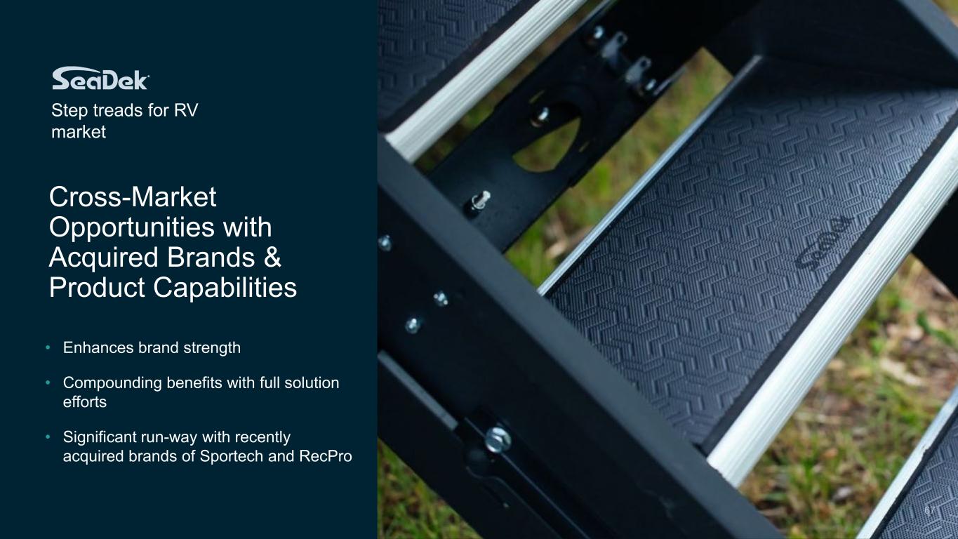 Cross-Market Opportunities with Acquired Brands & Product Capabilities • Enhances brand strength • Compounding benefits with full solution efforts • Significant run-way with recently acquired brands of Sportech and RecPro Step treads for RV market 67